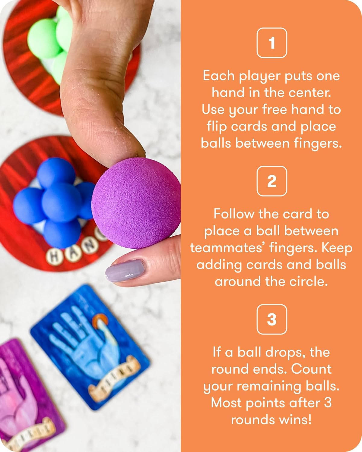 HANDS-ON FAMILY GAME NIGHT: Handy is a hilarious fine motor skill game using cards to direct play and gets everyone laughing. Simply balance squishy balls between fingers and build a “hand tree” with your partners on either side before the balls drop.