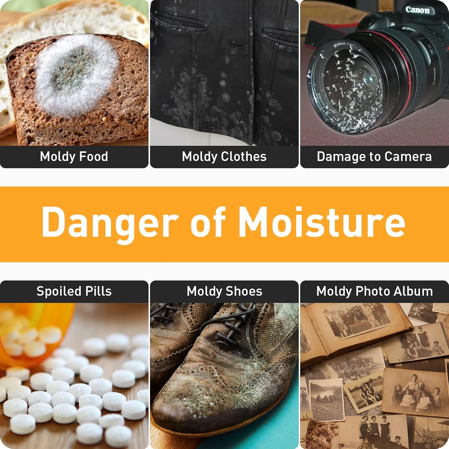 【No More Moisture】 – With highly active adsorption material, desiccant packs for storage can absorb up to 40% of its weight in water vapor. Simply place the desiccant packs with your belongings and they will effectively absorb moisture from the air to prevent musty smell, corrosion, rust and other moisture damage.
