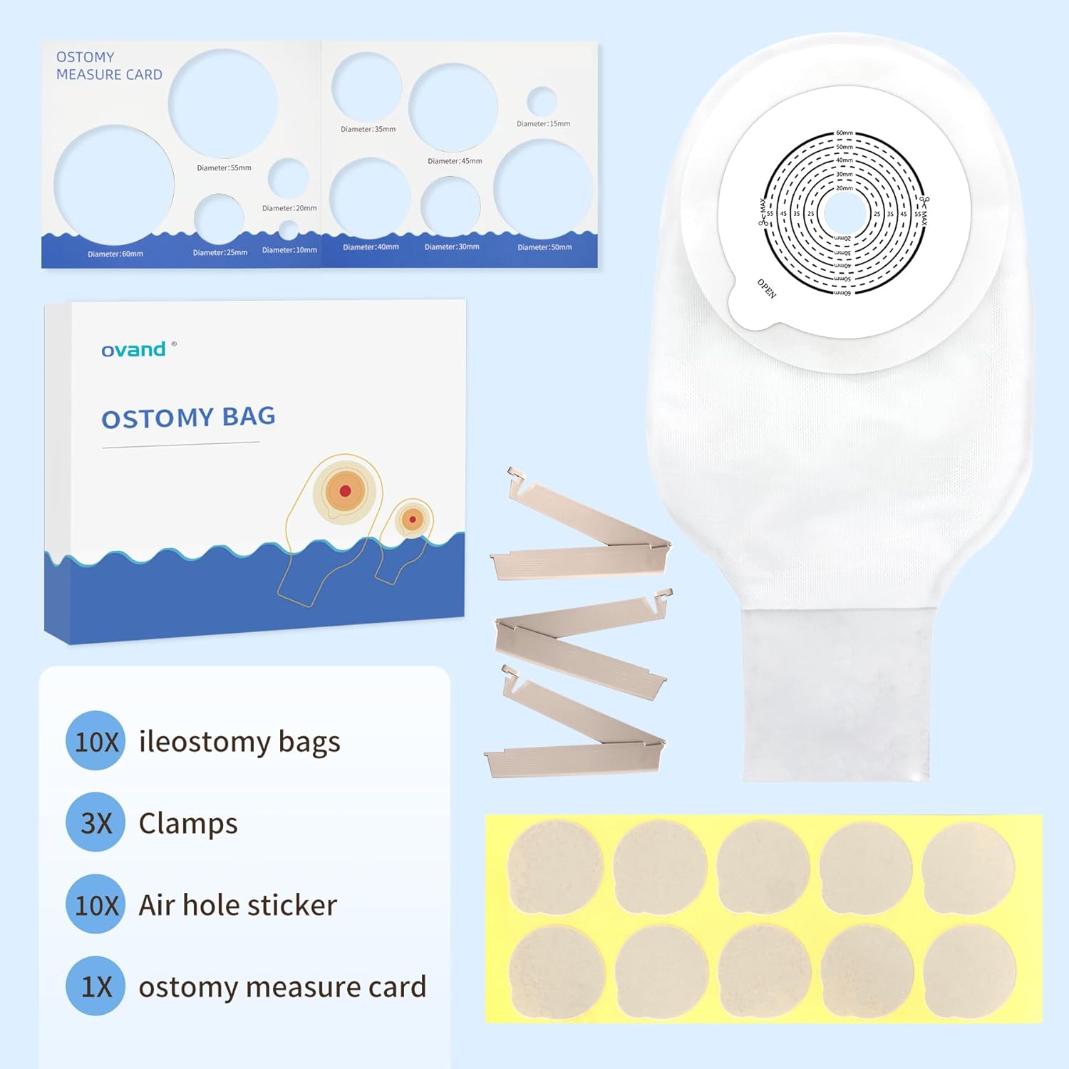 ✔PACKAGE INCLUDE : 10PCS One-piece ileostomy bags, ostomy measure card, 3x clamps,Air hole sticker.