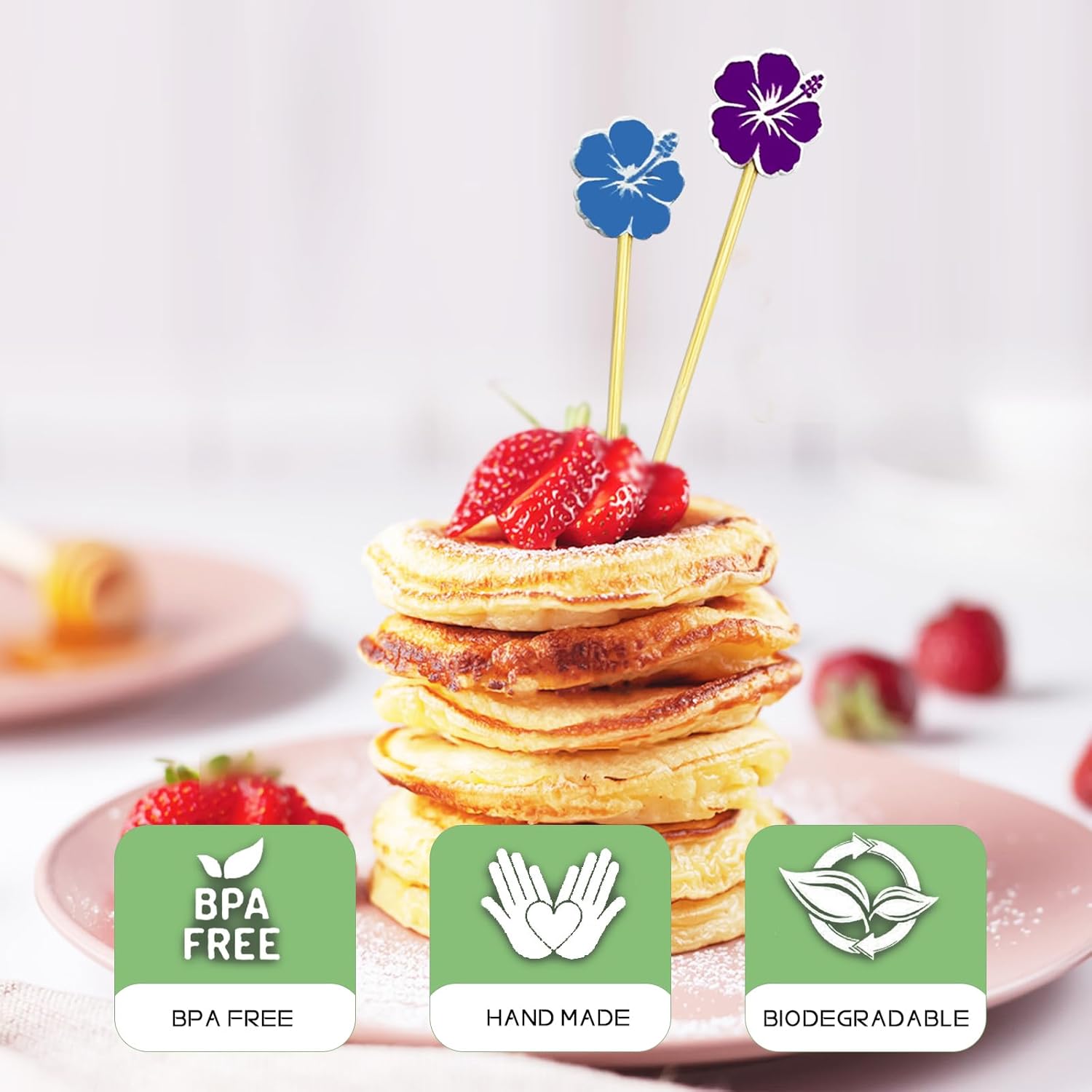 【100 PIECES COCKTAIL PICKS SET】Cocktail pick set for Party Decorations includes 100 packs of bamboo sticks with Flower shape, which are enough for you to use in various scenarios. These bamboo sticks comes with 4.7 inches(12 cm). Please confirm the size you need before purchase.