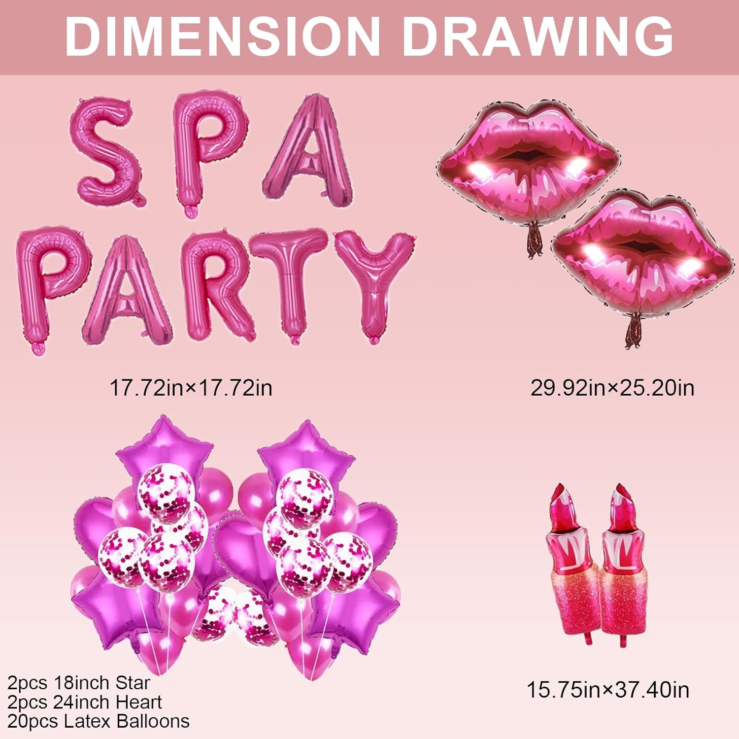 【SPA Party Decoration】includes 1 set of 16-inch “SPA PARTY” foil letter banners, 20 pieces of latex balloons, 4 pieces of 18-inch star foil balloons, 4 pieces of 24-inch heart foil balloons, 2 pieces of lipstick-shaped foil balloons, and 2 pieces of lip-shaped foil balloons. for spa party, slumber party, sleepover party, pajama party!