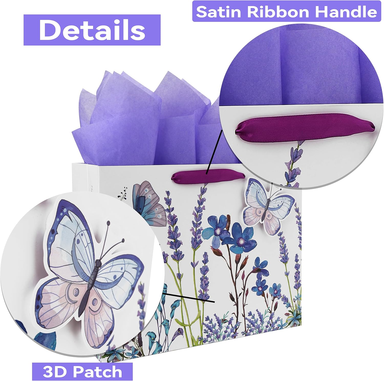 DISTINCTIVE DESIGN:Gift bag adorned with lavishly illustrated and subtly watercolored lavender and flowers, capturing the profound beauty of nature, while 3D butterfly in shades of blue add whimsy, symbolizing the ephemeral nature of beauty and infusing the design with a sense of lively movement.