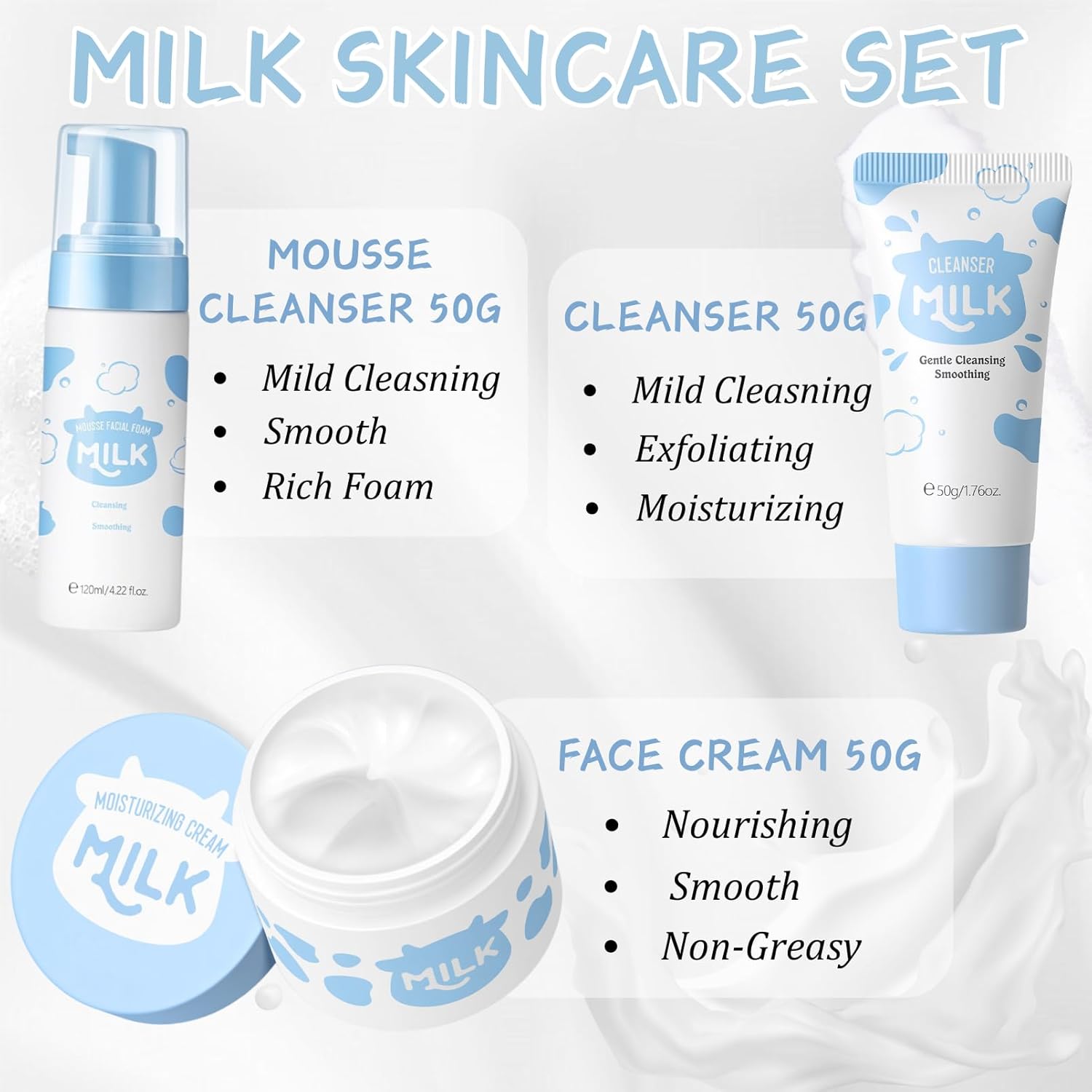 Our milk skin care routine kit for women essentials offers a complete skincare regimen to help cleanse, hydrate and nourish skin.