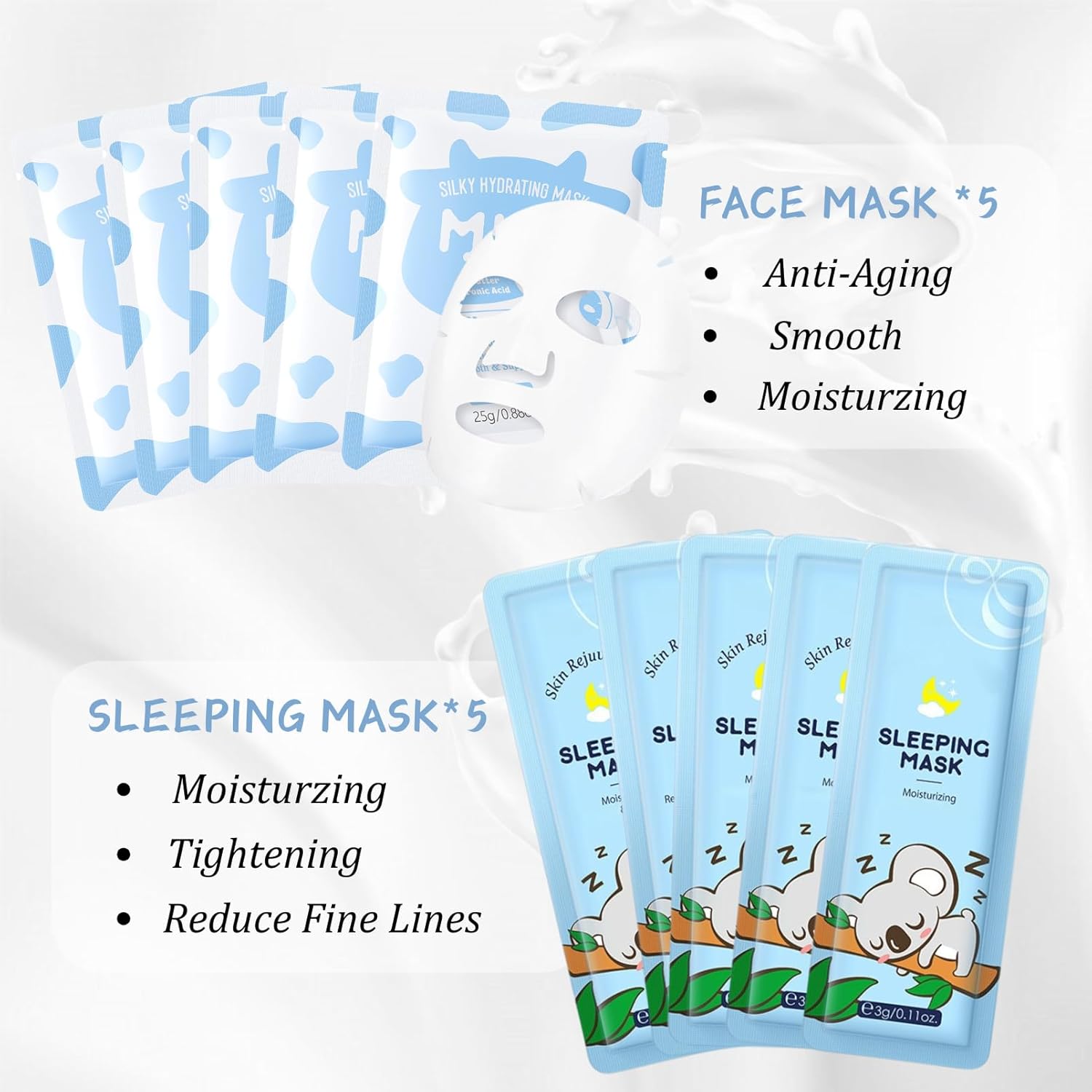 【Complete Skincare Routine】 This 14PCS milk skin care set for girls offers a full range of skincare solutions from cleansing to nourishing, including mousse cleanser, cleanser, 5pcs face mask and 5pcs sleeping mask, and adorable towel bear to meet your needs in the morning and at night. Our teen skin care kit for women are easy to deep cleanse and hydrate leaving your skin as smooth as milk.