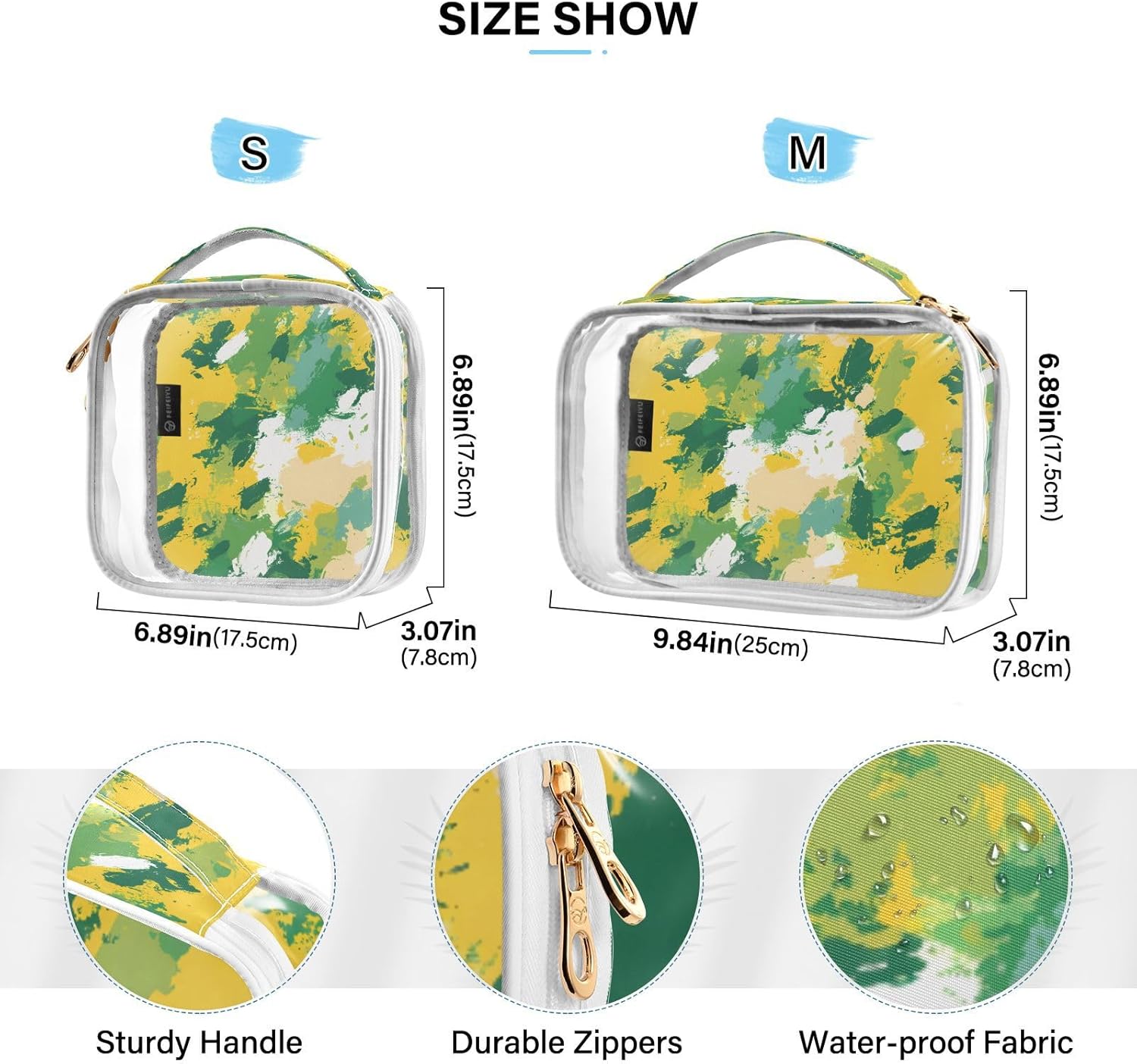 Material: Polyester & transparent PVC. The surroundings and front are transparent PVC material, so you can easily see the items in the bag. Printed twill weave on the handles and back. Waterproof.