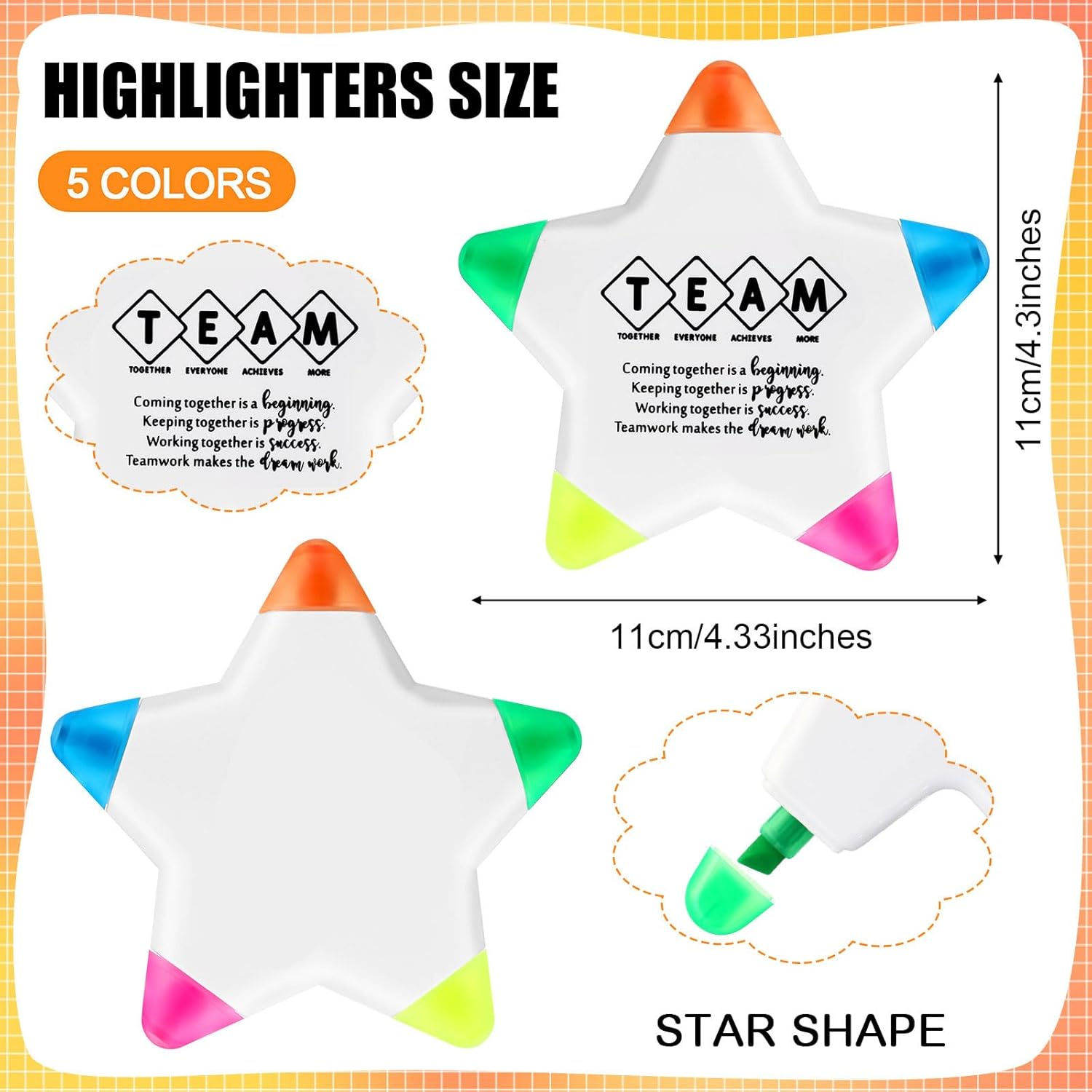 Motivational Star Highlighter Set: includes 20 star-shaped highlighters in 5 vibrant fluorescent colors, perfect for brightening important notes; Each highlighter is designed with motivational team quotes, inspiring positivity and encouragement, making them ideal gifts for team members or students