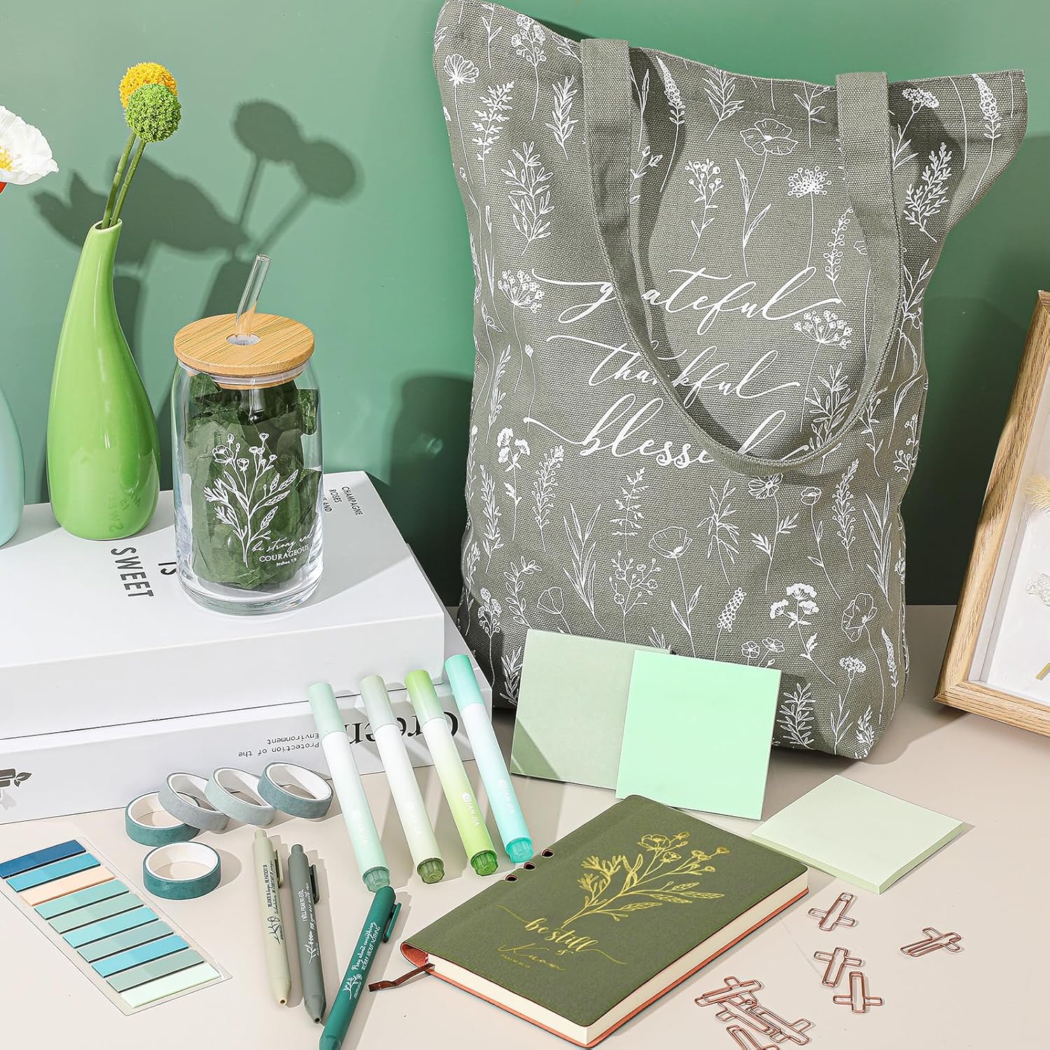 29 Pcs Bible Journaling Kit 16 oz Glass Cup Canvas Bag Leather Notebook Highlighters and Pens Sticky Note Tapes Grandparents Gift Bible Study Supplies for Teacher Women Nurse(Green,Boho)