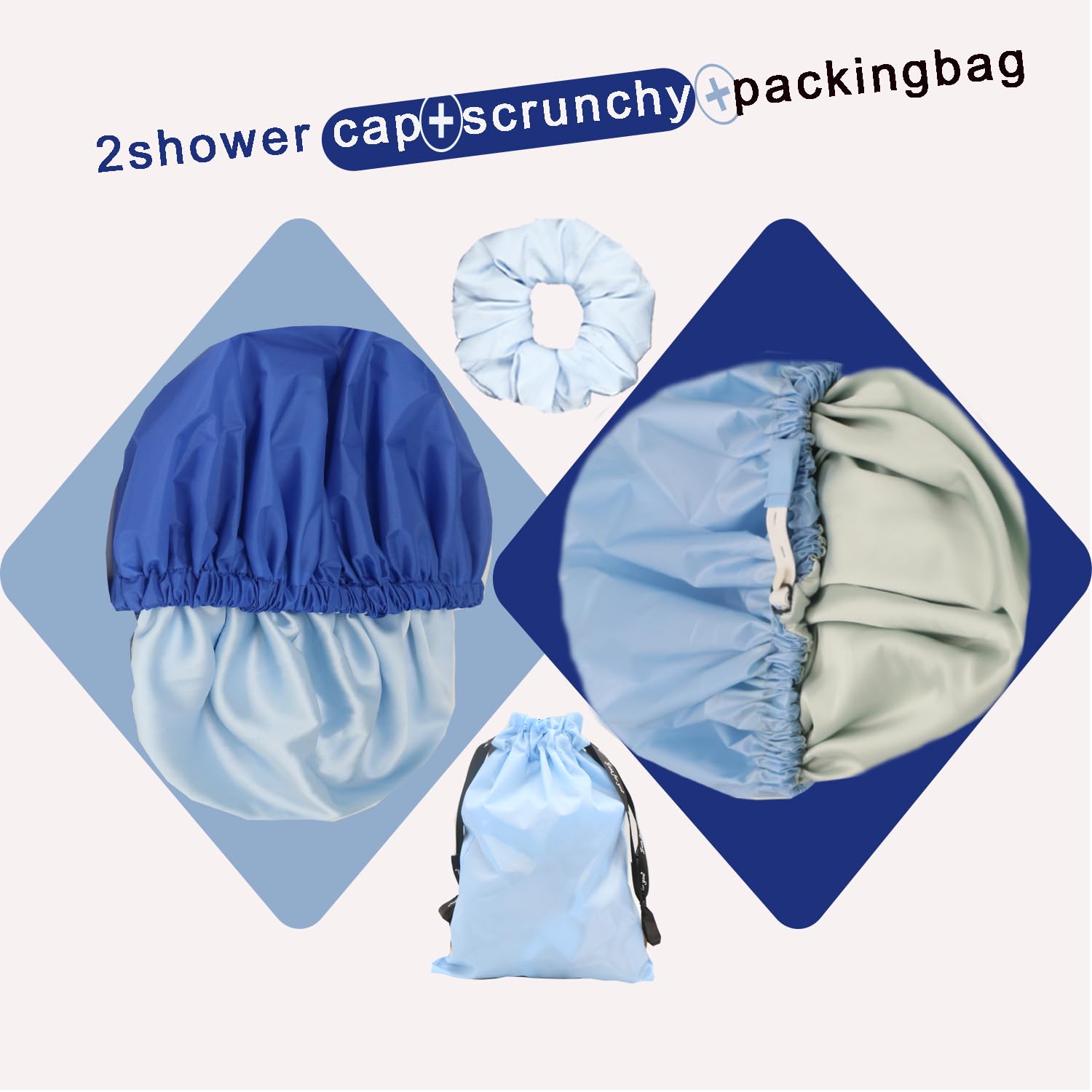 1.What You Get: 2pcs Adjustable Shower Cap for Women Waterproof with Satin Scrunchy and Packing Bag. Satin Scrunchy Can Hold Your Hair Firmly and Comfortable, Matching Bag for travels.