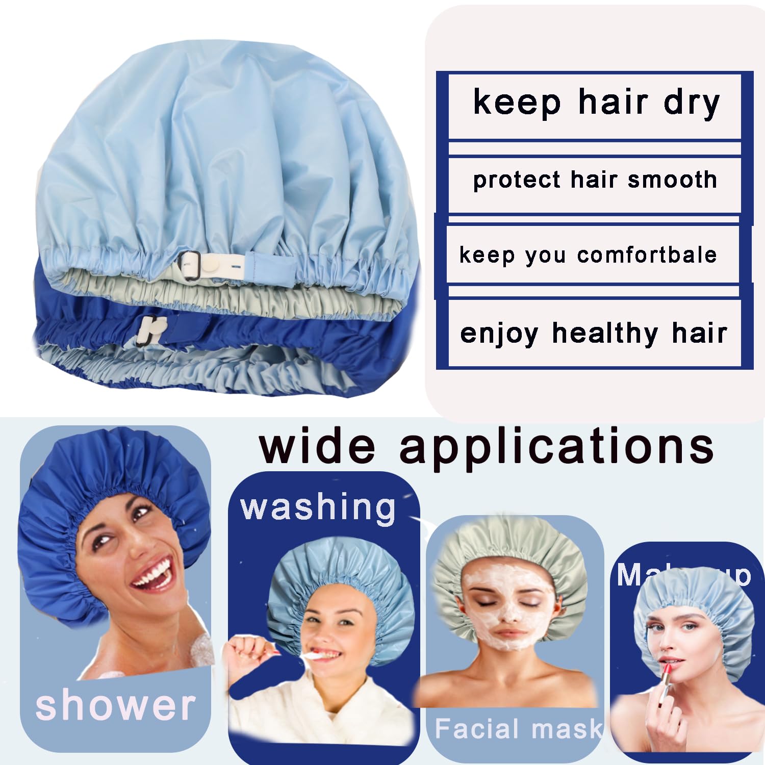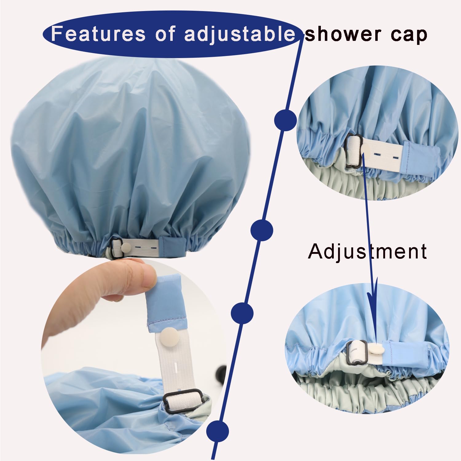 3.Large Adjustable Shower Cap: Large Reusable Women Shower Cap Is Upgraded to 14 Inches in Diameter, Enough Space to Cover Your Head While Bathing. The Shower Bath Cap Features with adjustable elastic and buttonhole, button band, As You Pull the Buckle, Keep Them in Place Perfectly.