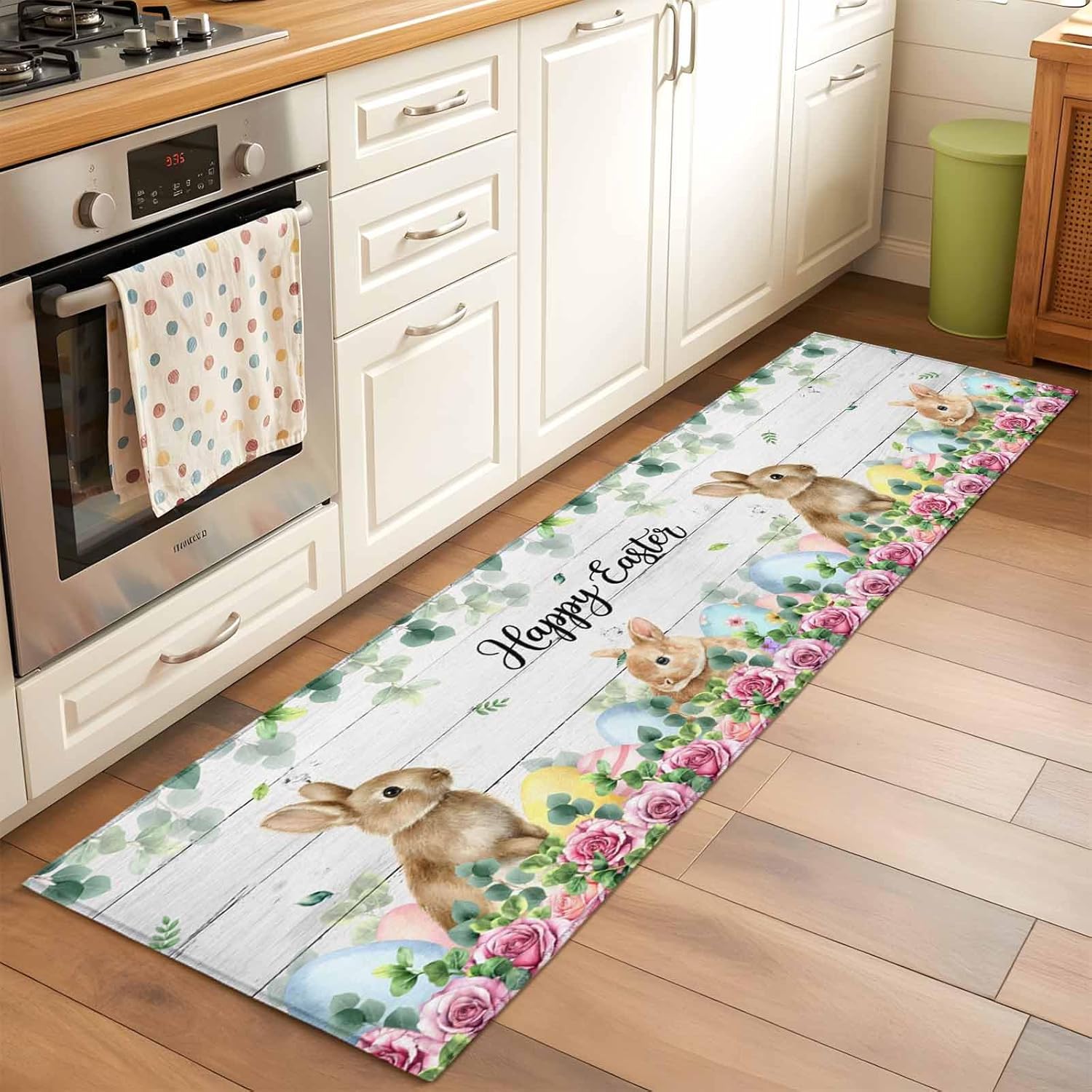 2×6 Runner Rugs for Kitchen, Easter Washable Rug Rectangular Indoor Carpet Non-Slip, Spring Watercolor Bunny Eggs Flower Leaf Wooden Grey Low Pile Bathroom Rug Kitchen Runner Rugs for Bedroom