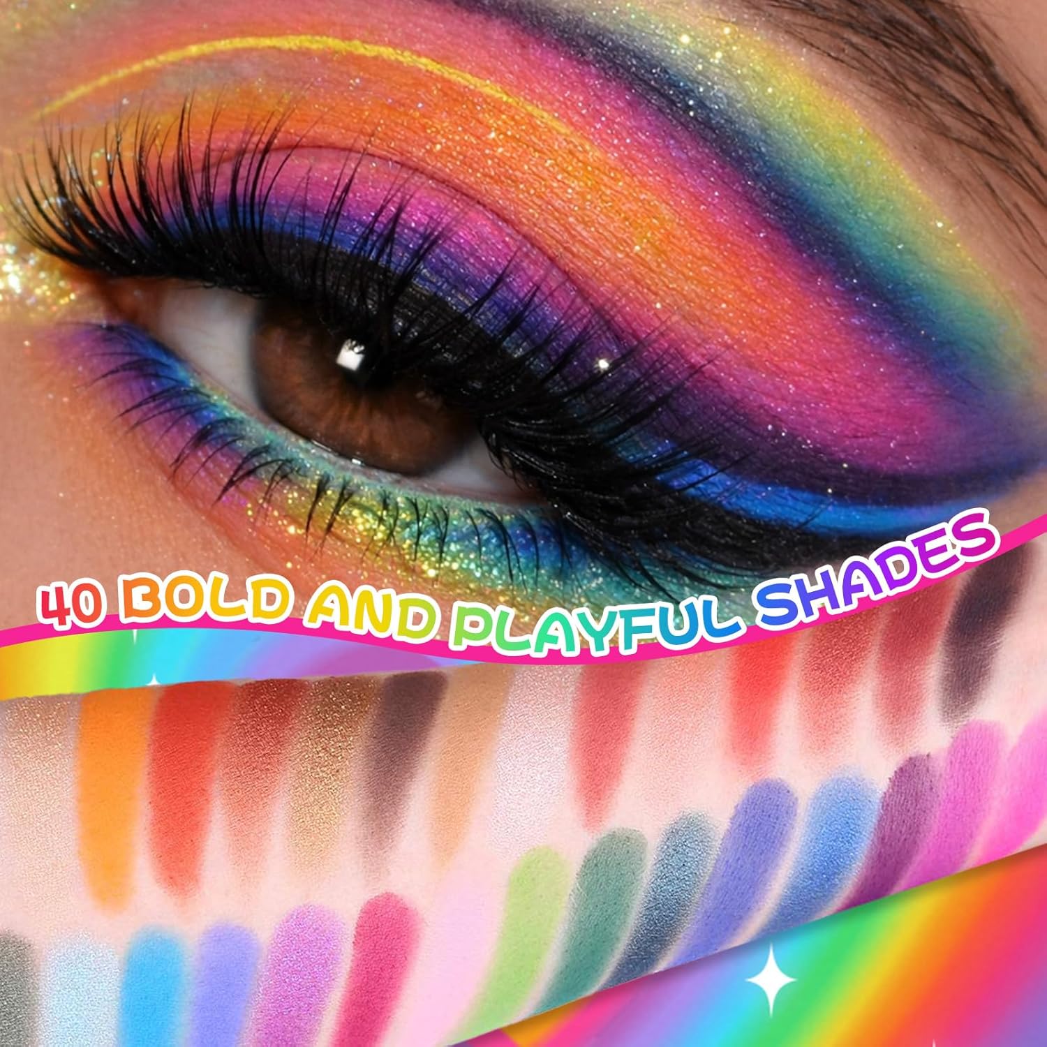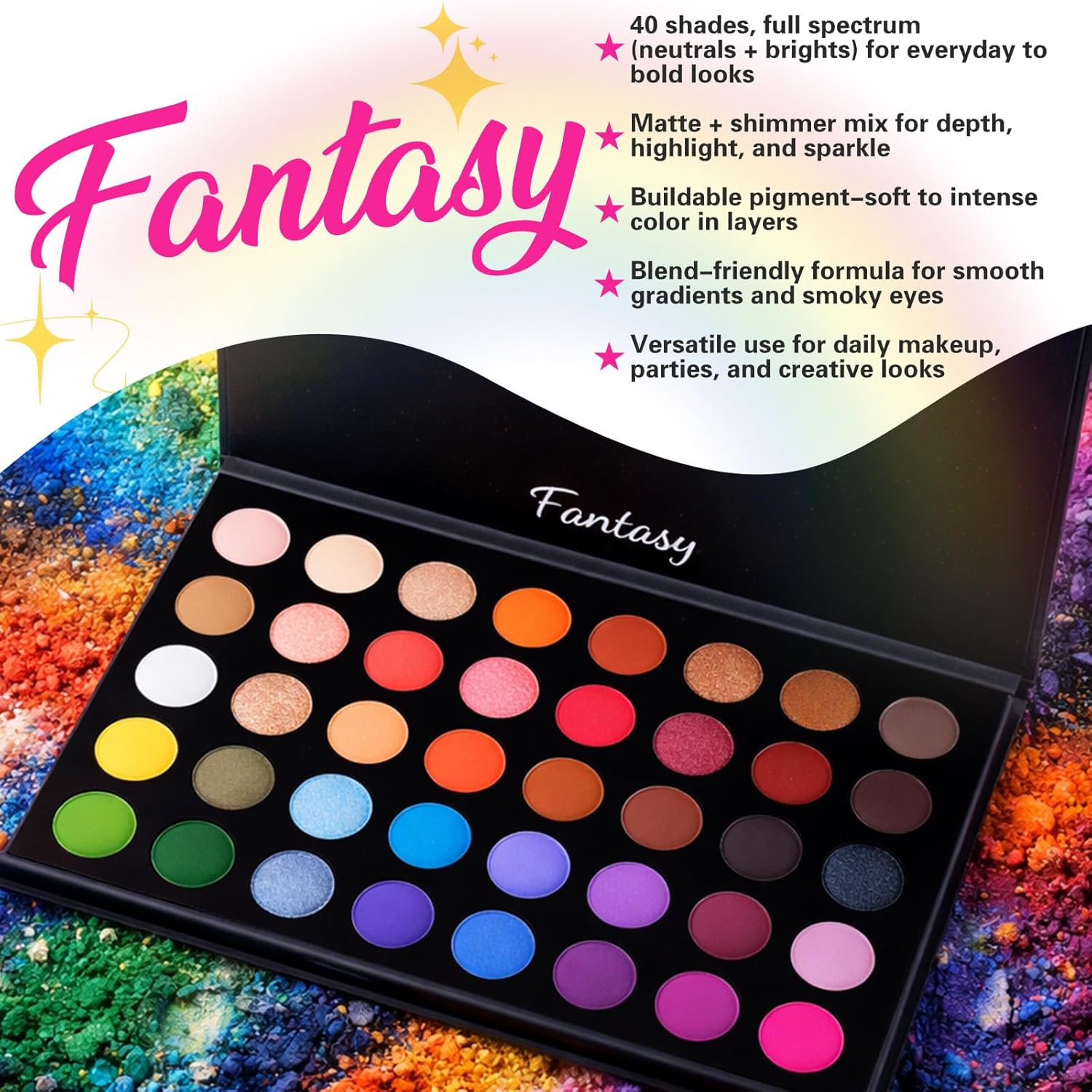 40-shade all-in-one color range: A complete mix of everyday neutrals plus statement brights—warm browns, peaches, reds, golds, purples, blues, greens, and pinks—so you can create natural office looks, soft glam, smoky eyes, or full creative makeup with one palette.