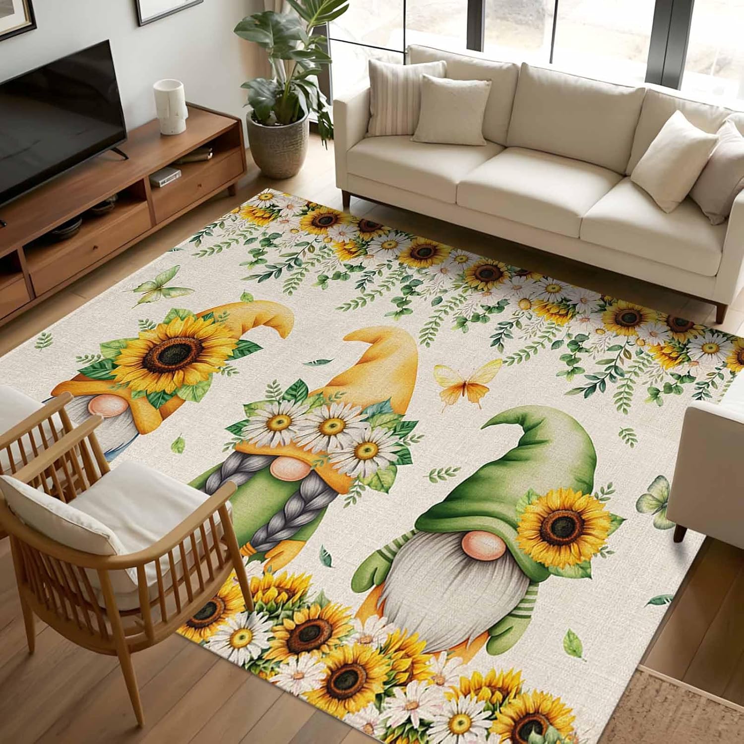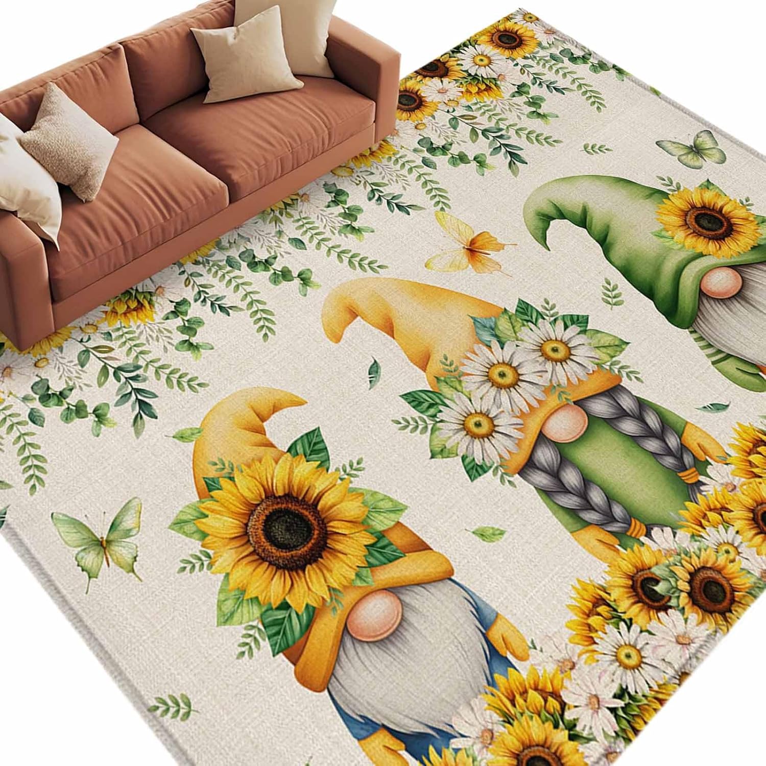 5×7 Area Rugs for Living Room, Spring Gnomes Washable Rug Rectangular Indoor Carpet Non-Slip, Retro Botanical Flowers Leaves Butterfly Low Pile Bathroom Rug Kitchen Runner Rugs for Bedroom