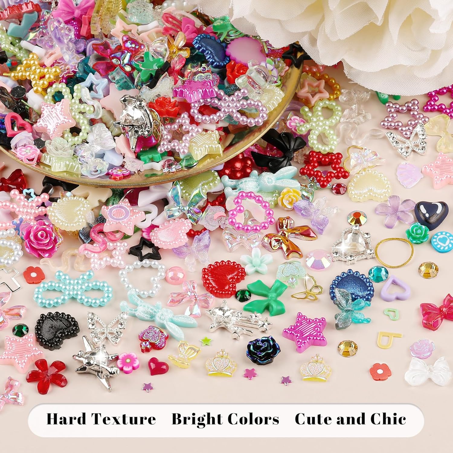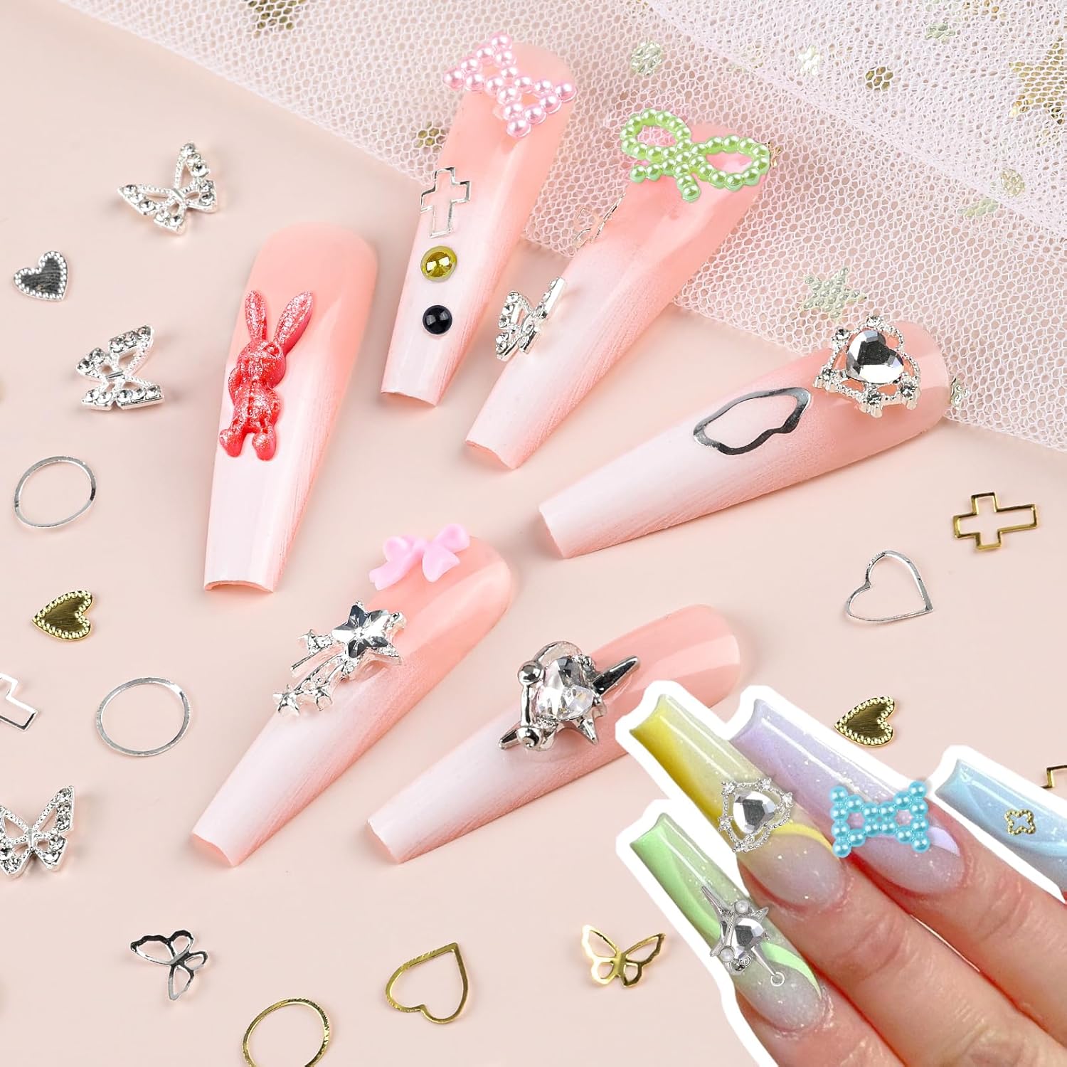 600Pcs Kawaii Nail Charms Kit: 200 x rabbit bear moon flower charms, 100 x mixed size flatback rhinestones, 100 x flower animal nail art slices, 100 x assorted glitter nail sequins, 50 x gold&silver nail studs charms, 40 x hollow&solid pearl nail charms, 8 x heart star y2k nail charms, 4 x alloy butterfly nail charms with rhinestones.