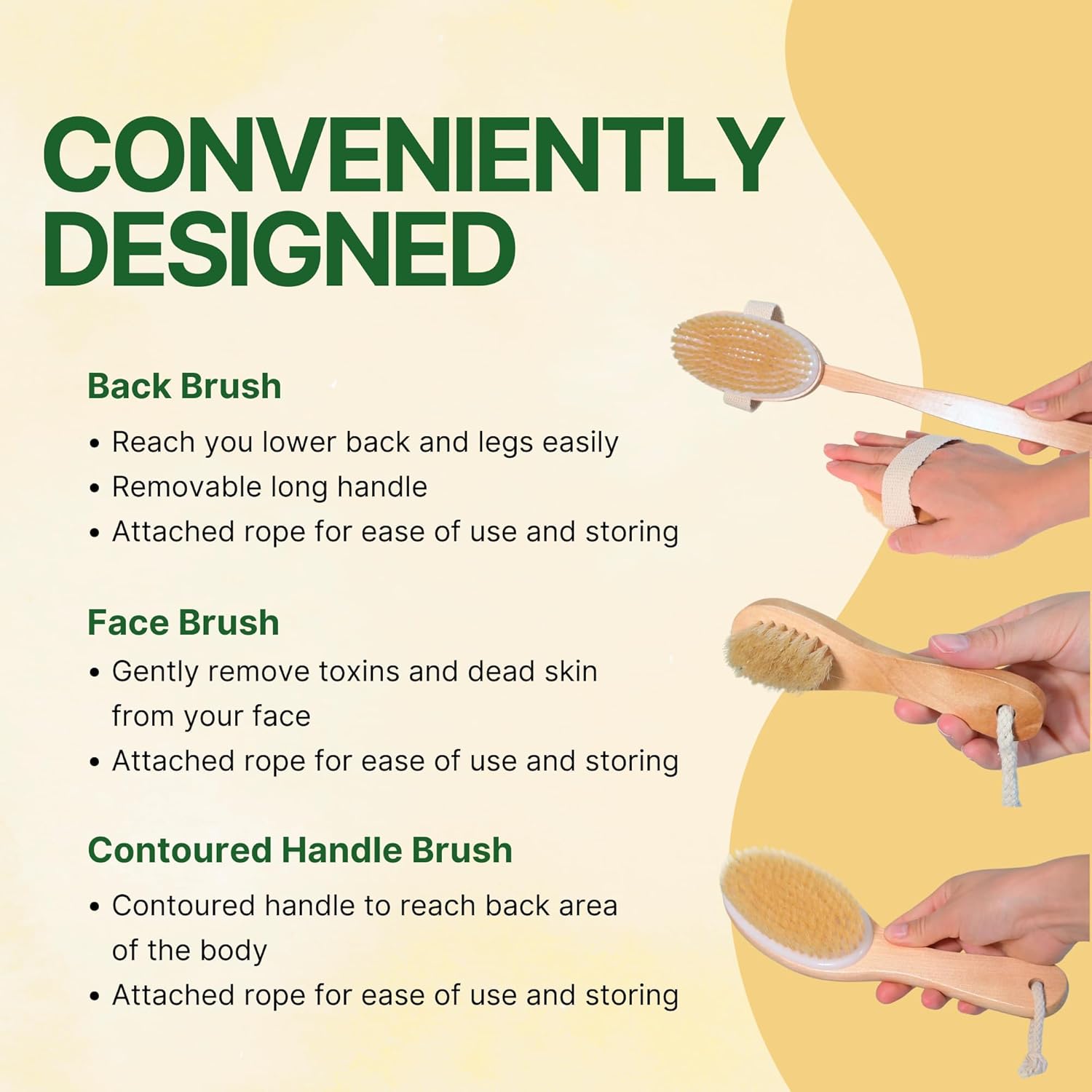 COMPLETE DRY BRUSH SET: Asani’s 3-piece kit covers every skin need. Detachable long-handled back brush, contoured body brush, and facial exfoliator provide head-to-toe care. Elevate your routine for enhanced lymphatic drainage and radiant skin.