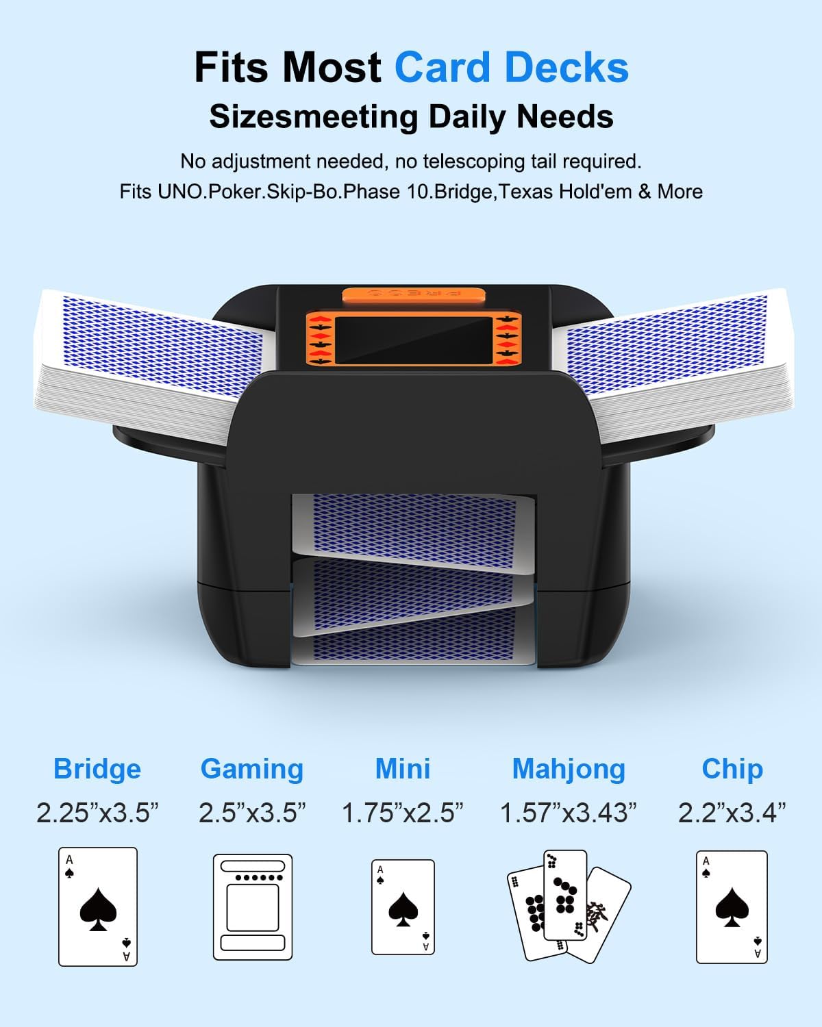 【Card shuffler 2 deck,Ultra-Fast & Efficient】Faster, More accurate, Fairer,shuffles 1-2 decks of cards in just 2-5 seconds, saving time compared to manual shuffling.Perfect for poker nights, casino-style games,home, party, office, travel, magic trick equipment, outdoor camping,friends gathering or family game sessions,It can save a lot of shuffling time, more time to enjoy the fun of playing card games,for Every Joyful Game Moment with Family & Friends
