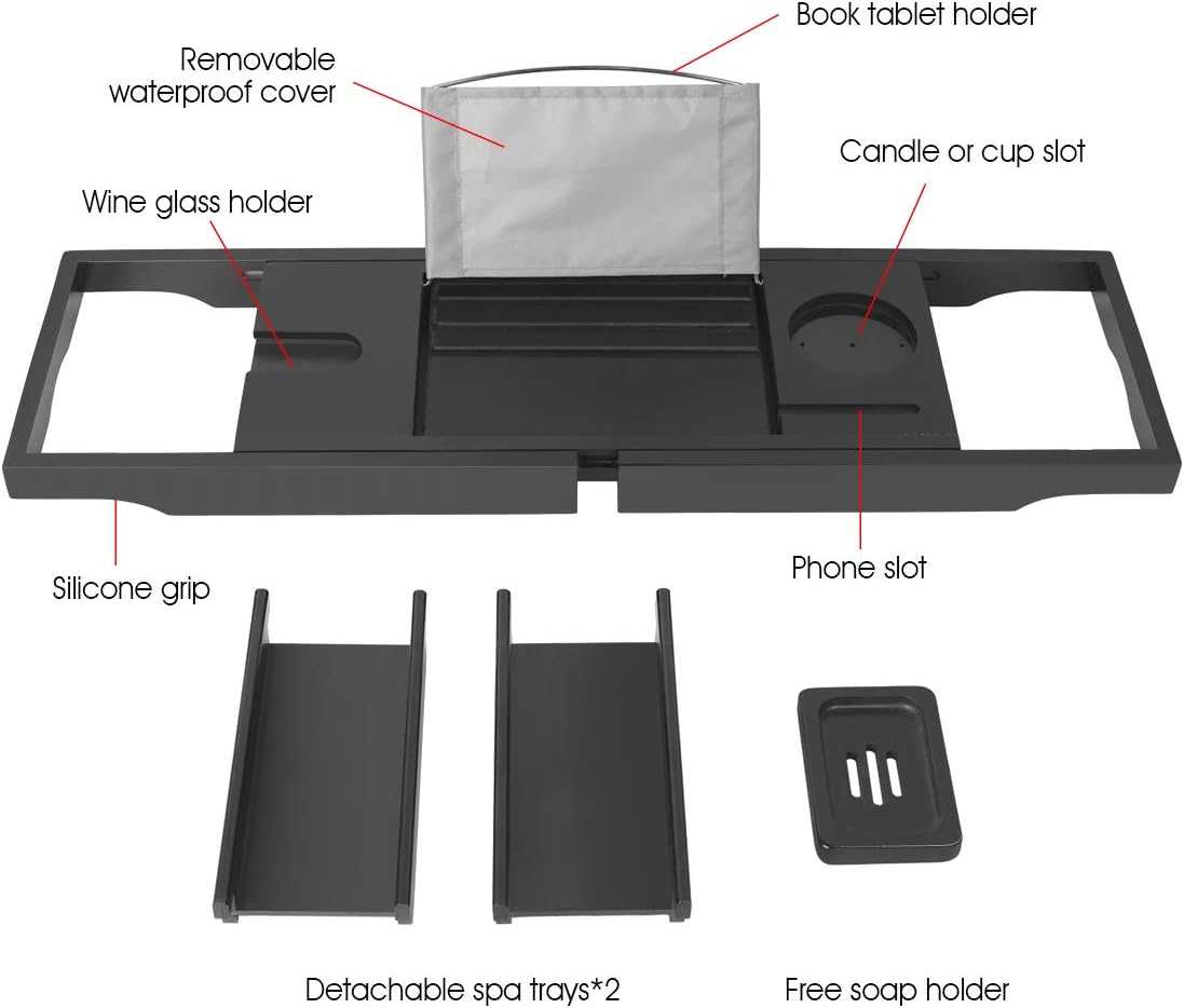 MULTI-FUNCTIONAL: This bamboo bath tray features 3 reading angles for ideal viewing experience of your book or Ipad, the wine glass holder,cup holder, phone slot and two side-trays are designed for your bath time. Enjoy bubble baths with your essentials within reach.