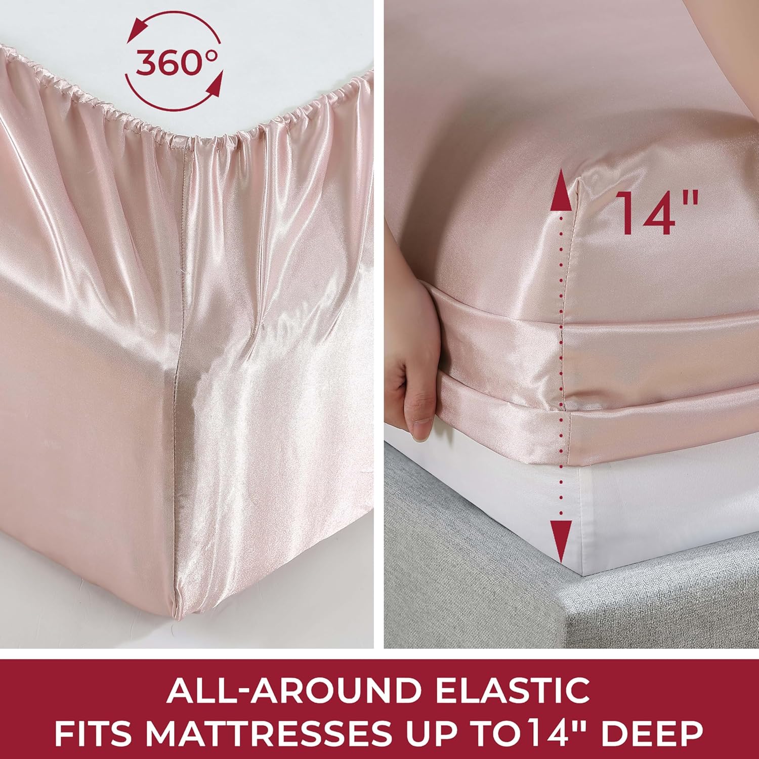 This 100% Luxury Satin Polyester Solid Sheet Queen set includes a 90×102+4 in. flat sheet, a 60×80+14 in. fitted sheet, and 2 pillowcases 20×30+4 in. Our crisp shiny silky-smooth sheets are durable, resists fading and wrinkles. The fitted sheets have deep pockets and are fully elastic, making them easy for you to put on your mattress. The sheets are designed to fit all mattresses with a depth that does not exceed 14 inches. Consistent quality, innovative design and reliability that provides a luxurious, gentle, and comfortable sleep. Easy care machine wash cold, gentle cycle. Use only non-chlorine bleach. Tumble dry low, remove promptly. No ironing necessary.