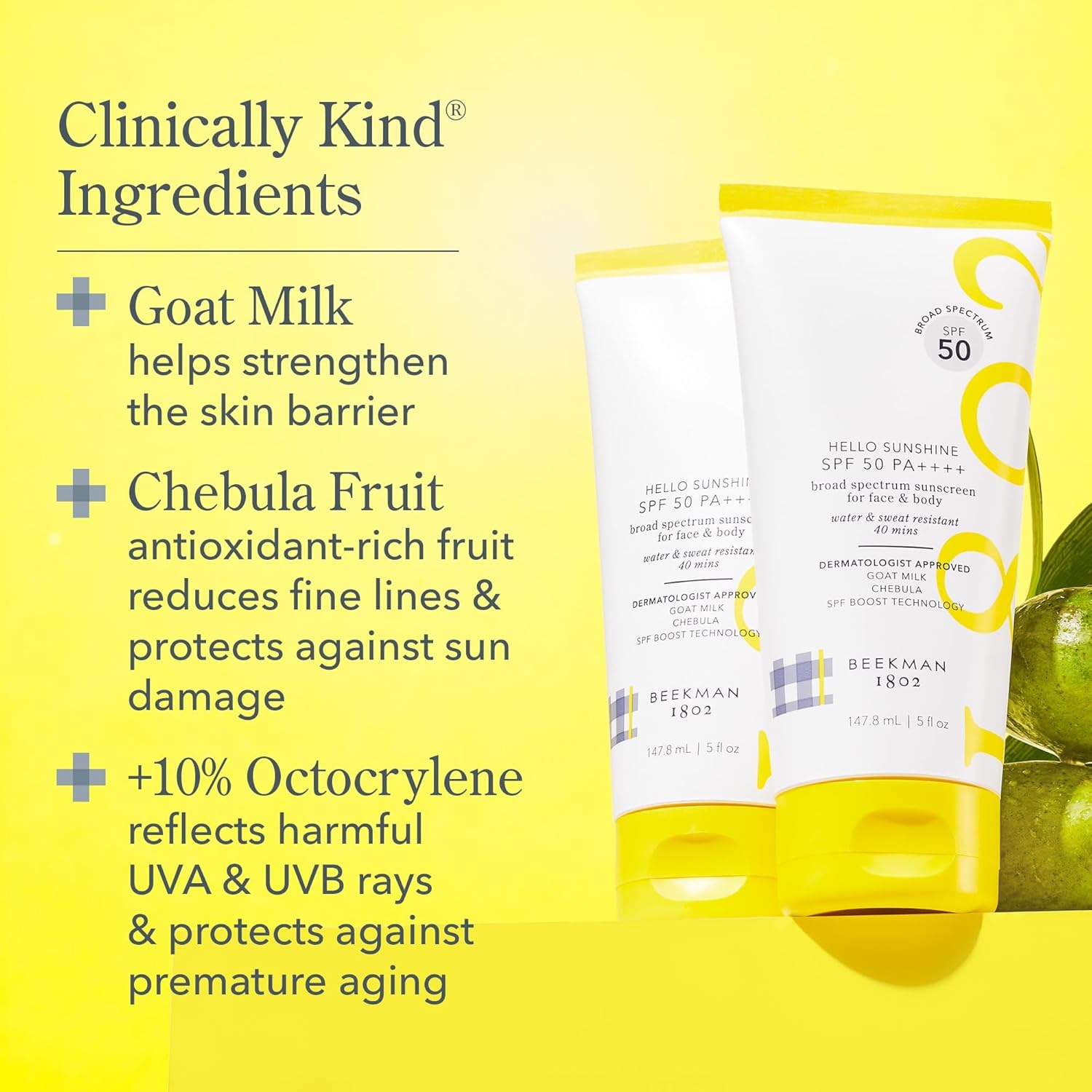 HELLO SUNSHINE SPF 50 – Hello Sunshine SPF 50 is a clinically proven, better-aging goat milk sunscreen for face and body. While fragrance-free, you may notice natural scents of botanical ingredients.