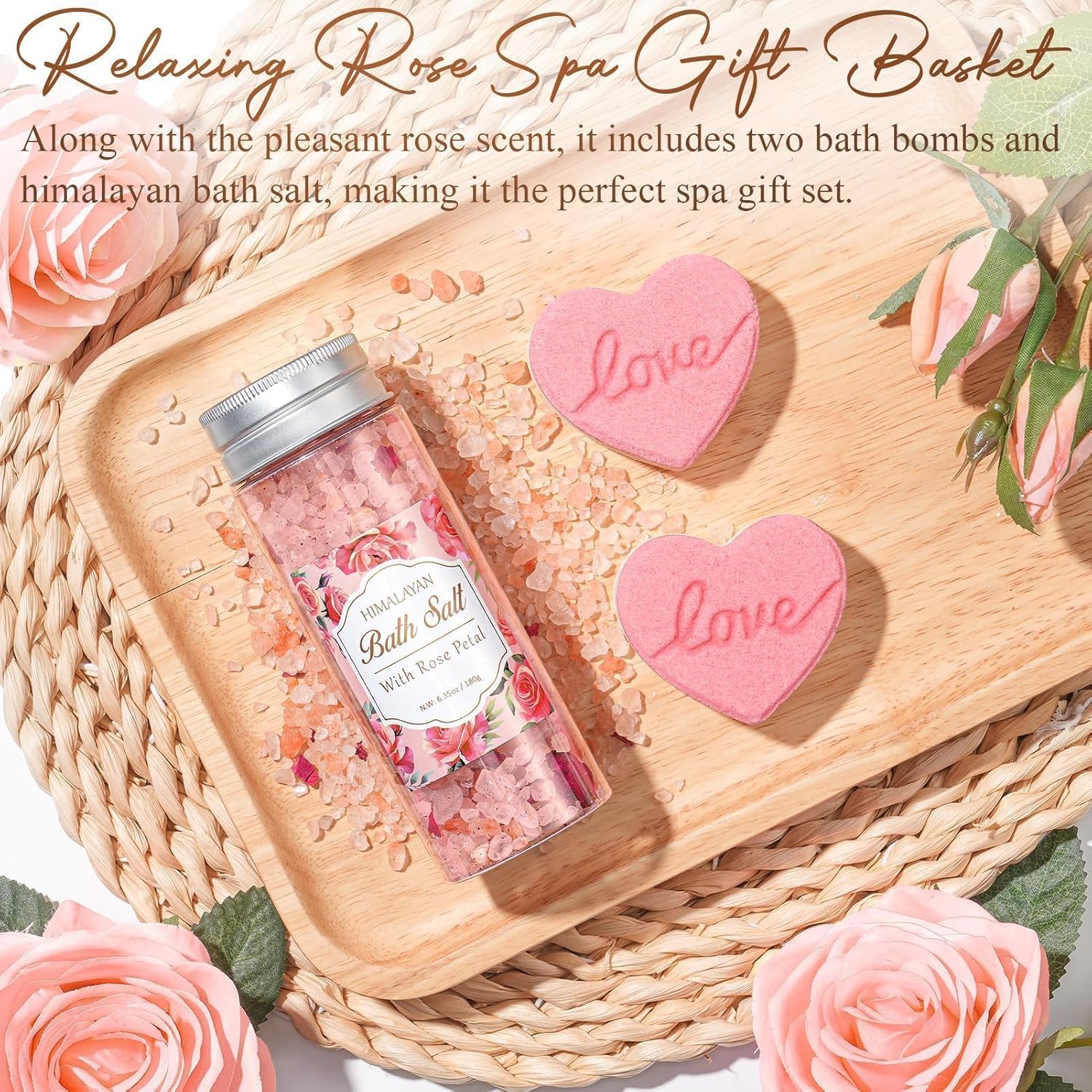 ROSE-SCENTED RELAXING SPA GIFTS: The 2.8oz rose scented candle in our relaxing spa gifts baskets self care gifts for women is made of premium soy wax, can burn smokelessly & evenly for up to 20 hours. Comes with a HIMALAYAN bath salt and two heart shaped bath bombs, each infused with long-lasting rose fragrance, will transform any bath into a sublime, relaxing retreat, help soothe her mind & relax body. Treat her with this relaxing bath gift set spa gifts for women birthday gifts for mom women