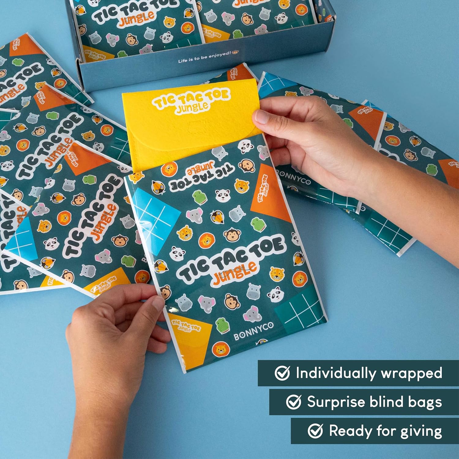 JUNGLE TIC TAC TOE PARTY FAVORS FOR KIDS – A pack of 16 tic tac toe, perfect as goodie bags stuffers for kids. This set includes 4 orange, 4 yellow, 4 green, and 4 blue boards. Each board is envelope-shaped and comes with 12 counters, featuring two types of safari animals: elephant and toucan, monkey and lion, panda and tiger, and hippo and crocodile. Ideal as kids party favors