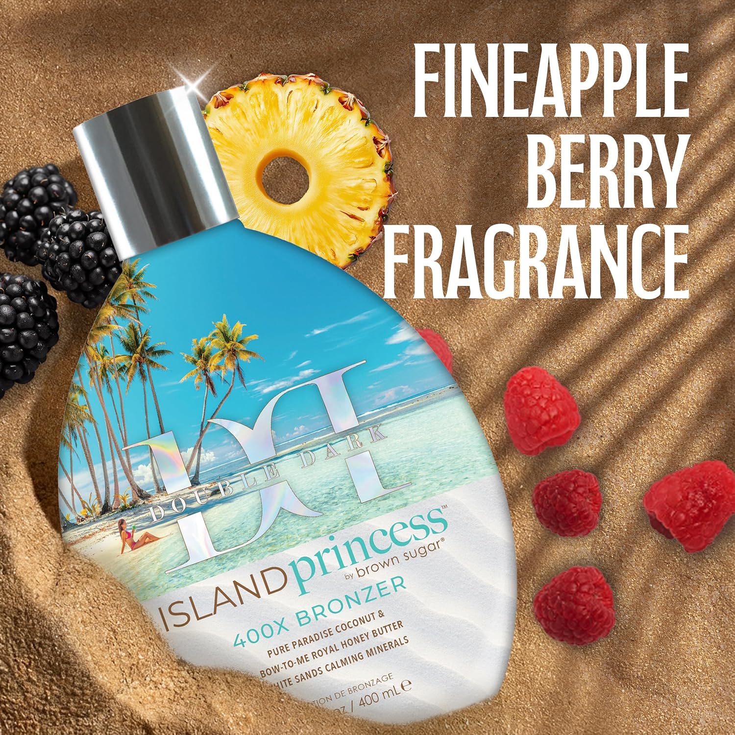Rule your personal paradise with Brown Sugar Double Dark Island Princess Tanning Lotion, a 400X bronzer that evokes visions of palms, salty air, black sand beaches and sun-kissed island glows. Double Dark 400X bronzing is custom blended for color fit for a queen, while bow-to-me royal honey butter wraps skin in elevated conditioning for a smooth, radiant finish. White Sands Calming Minerals and a tropical cocktail of exotic extracts help calm and refine the look of skin as they work toward that unmistakable vaycay glow, and body art tattoo enhancers amplify the vibrancy and luminosity of your ink. Finished with a Fineapple Berry fragrance, this doubly dark spell is back and twice as nice—perfect whenever you’re ready to step into your role as true tanning royalty.