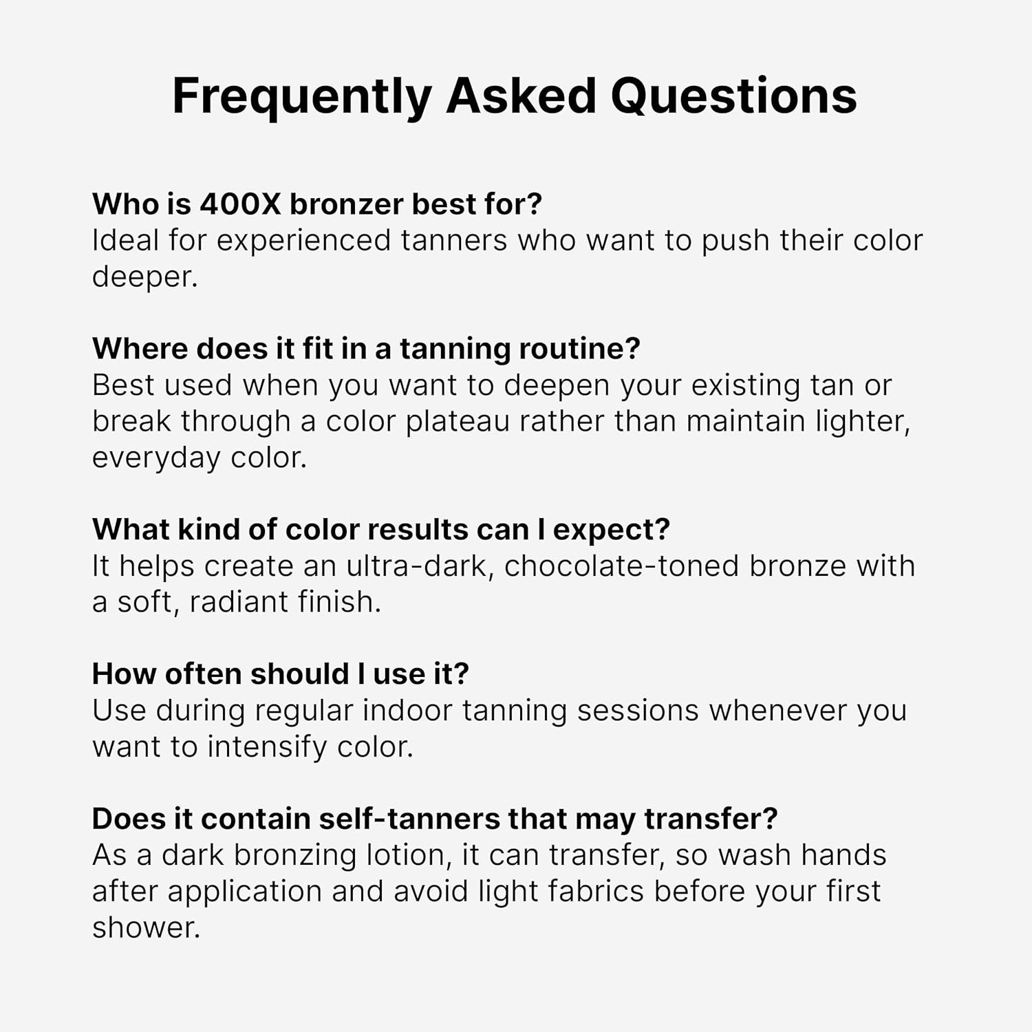 400X Wildbronzer: Completely new 400X Wildbronzers utilize nature’s most potent extracts for plateau-busting ultra-dark color that lets your wild side show
