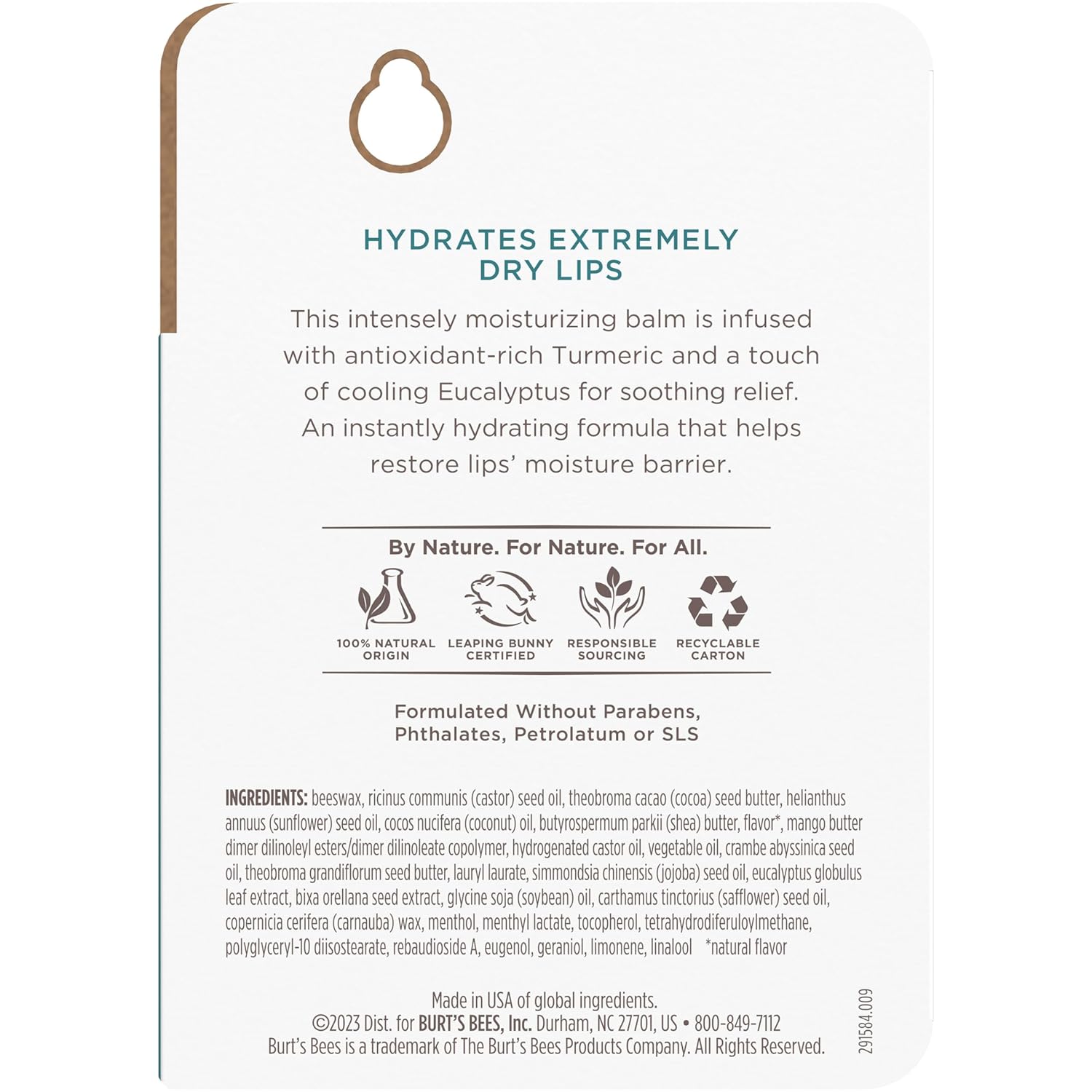 Repair extremely dry lips with Burt’s Bees Rescue Balm. Infused with responsibly sourced beeswax, jojoba oil and antioxidant-rich turmeric, this moisturizing lip balm instantly hydrates to repair and promote healing for dry, chapped lips. Made with nourishing waxes and butters, Burt’s Bees Rescue Balm provides a protective moisture barrier and delivers long-lasting moisture when applied every four hours. Cooling Eucalyptus offers soothing relief for dry lips. Formulated without parabens, phthalates, petrolatum or SLS, this lip moisturizer is 100% natural origin to rejuvenate and moisturize lips with clean ingredients. You can conveniently tuck a tube of Rescue Balm into your pocket, purse or backpack to keep nurturing lip care handy always. Burts Bees is the No. 1 dermatologist-recommended natural skin care brand (1). (1) Based on a November 2023 NielsenIQ national survey of U.S. Dermatologists