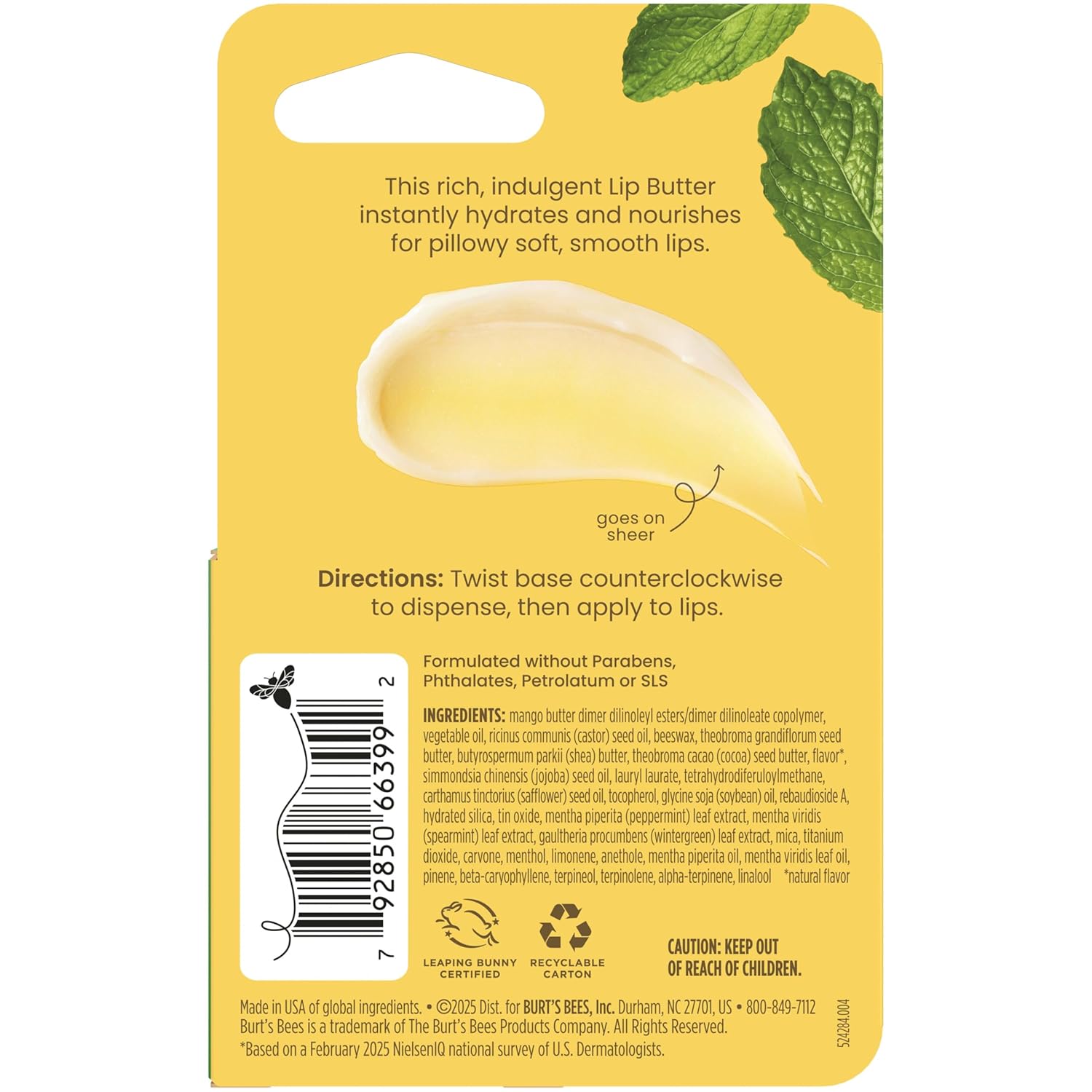 Burt’s Bees Sweet Mint Lip Butter repairs dry, parched lips. This rich, indulgent lip butter, with refreshing, sweet mint flavor, deeply conditions and replenishes moisture for pillowy soft, smooth lips. It instantly hydrates lips and provides 24 hour hydration to protect the lips’ natural moisture barrier. Made with shea and mango butters, and antioxidant rich Vitamin E; it also includes responsibly sourced beeswax that provides a breathable, protective barrier. Burt’s Bees Sweet Mint Lip Butter goes on sheer and comes in a convenient twist up dispenser. It is made without parabens, phthalates, petrolatum, or SLS and comes in a recyclable carton. Burt’s Bees is Leaping Bunny Certified, and is the #1 dermatologist recommended natural skin care brand(1) with lovely crafted products not tested on animals. (1)Based on a February 2025 NielsenIQ national survey of U.S. Dermatologists