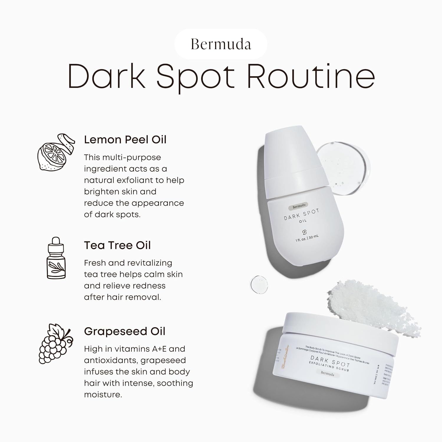 How Bermuda Oil Works: Formulated with 6 natural ingredients to help improve the appearance of dark spots on the body. The proprietary blend of jojoba seed oil, tea tree oil, lemon peel oil, and grapeseed oil exfoliates the skin naturally, brightens and softens it, reduces look of discoloration, and is safe for even the most sensitive areas.
