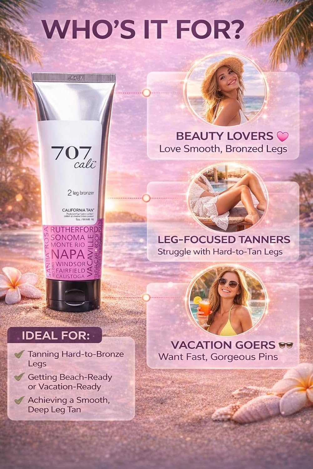 707 Cali Leg Bronzer is a Step 2 tanning lotion specifically formulated to enhance color on hard-to-tan legs. This tingle-free leg bronzer combines cosmetic bronzers with skin-conditioning ingredients to help deliver deeper, darker leg color while keeping skin hydrated and smooth.
