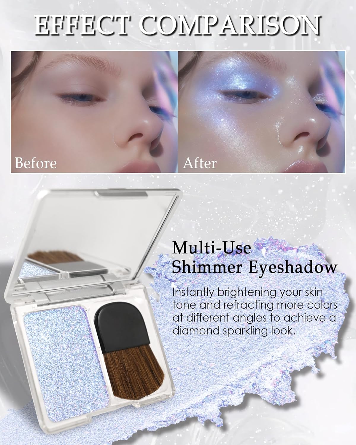 Dynamic Shimmer Effect – This glitter eyeshadow palette instantly brightens your complexion, Featuring a unique sparkle eyeshadow formula with light-reactive particles, it creates multi-dimensional iridescence that shifts between dazzling hues depending on the angle and lighting, delivering a diamond-like brilliance. Whether in soft daylight or vibrant evening lights, your look will captivate with its ever-changing hues.
