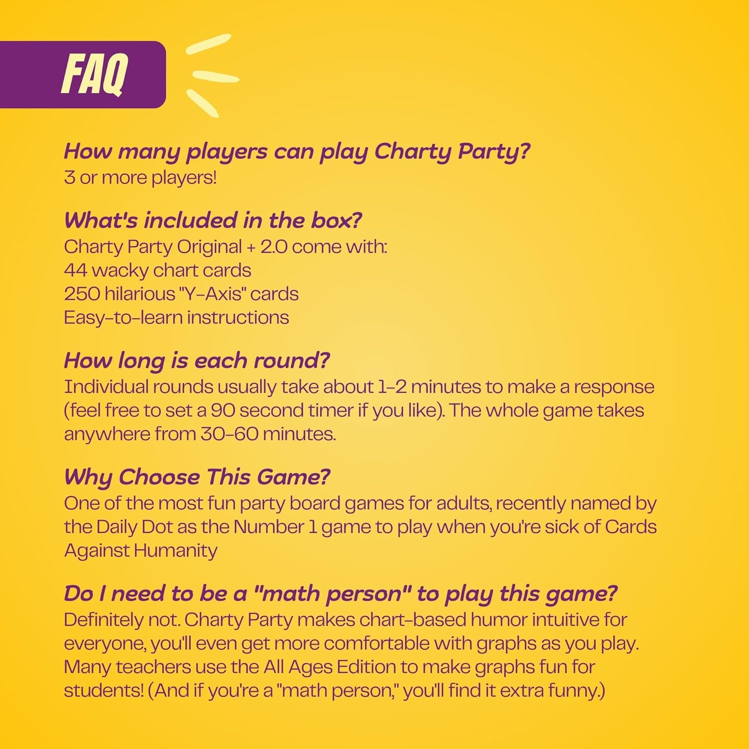 Turn Charts Into Comedy Gold: Each round, a player reveals a bizarre chart while the rest play their funniest Y-axis card to complete the graph. The judge picks the winner, and the laughs never stop. Charty Party is a clever party game for 3 or more players, ages 17 and up. Each round takes just 1 to 2 minutes, and a full game runs 30 to 90. No math degree or complex rules required. Just open the box, pick a card, and start the chaos.