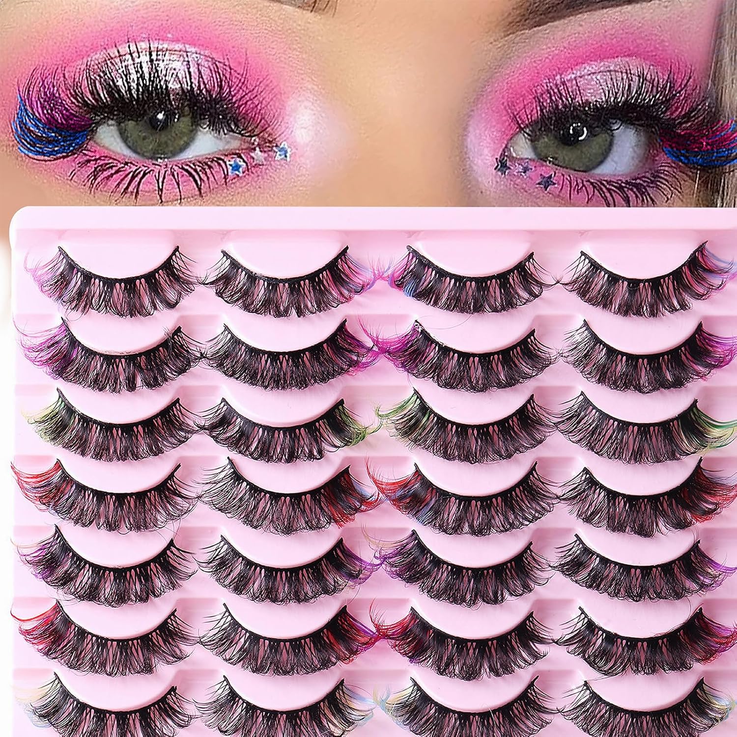 Colored Eyelashes, 14 Pairs Mink Fluffy Eye Lashes with Color on End, Dramatic Long Thick Colorful Lash Clusters, Full Curly False Eyelash Cat Fox Eye Lashes, 3d D Curl Salon Extensions Strip