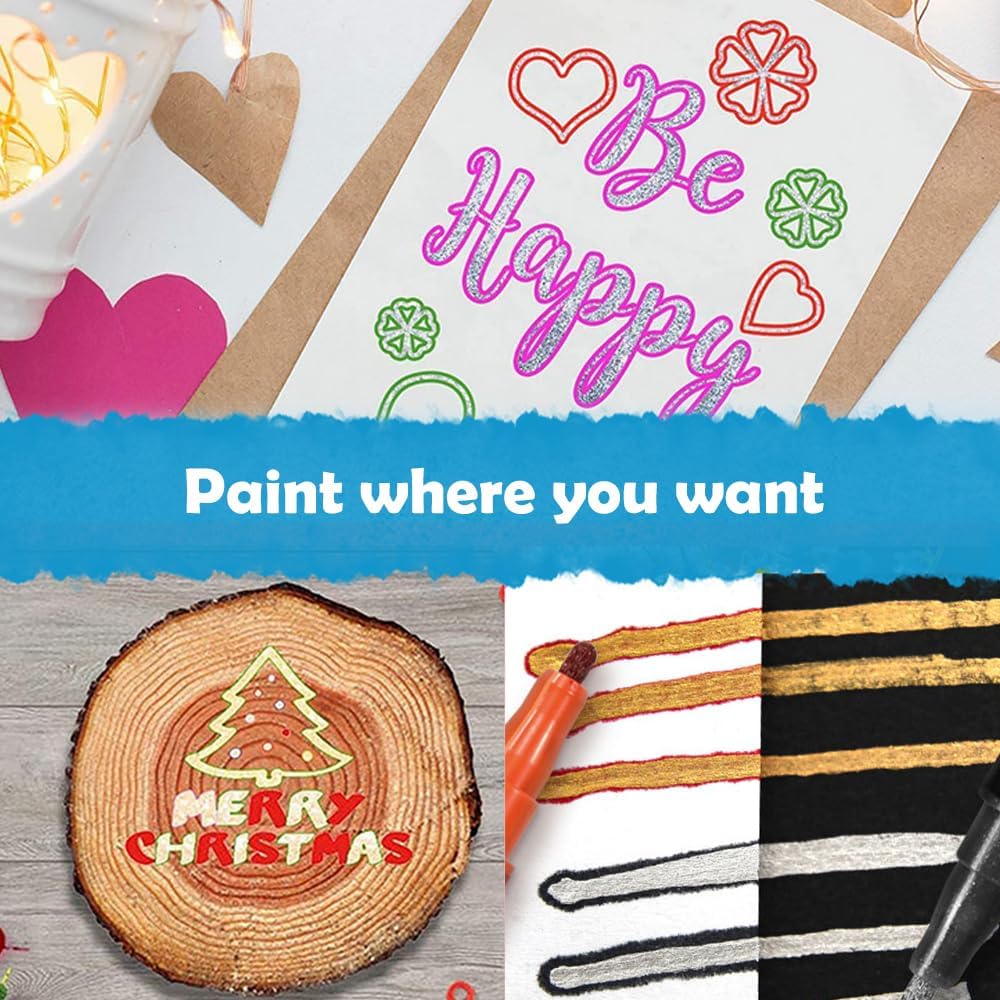 【Arts and Crafts for Kids】These double-line markers glitter outline pens are suitable for greeting cards, journaling, scrapbooking, Easter egg decorating, Christmas decorations, and more. You can use them on ceramic, glass, pottery, wood, rubber, plastic, stone, and other craft projects thanks to their versatile design.