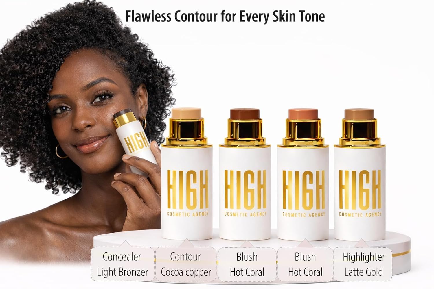 The Copper Contour Collection by HIGH Cosmetic Agency is a refined cream contour system designed to sculpt, warm, and illuminate the complexion with a natural, sun-kissed finish. This expertly curated set features four essential shades — Light Bronzer, Hot Coral Blush, Cocoa Copper Bronzer, and Latte Gold Highlighter — created to enhance facial structure while adding warmth and radiance. Its creamy, smooth, and blendable formula melts effortlessly into the skin, allowing seamless application and customizable coverage without caking or settling into fine lines. Each shade is carefully developed to complement warm and neutral undertones, delivering a balanced, flattering look suitable for everyday wear or elevated makeup looks. Crafted with a commitment to conscious beauty, the Copper Contour Collection is 100% animal-free and cruelty-free, formulated with high-performance ingredients that provide long-lasting comfort and wear. The result is a polished, radiant complexion with a professional, luxury finish.