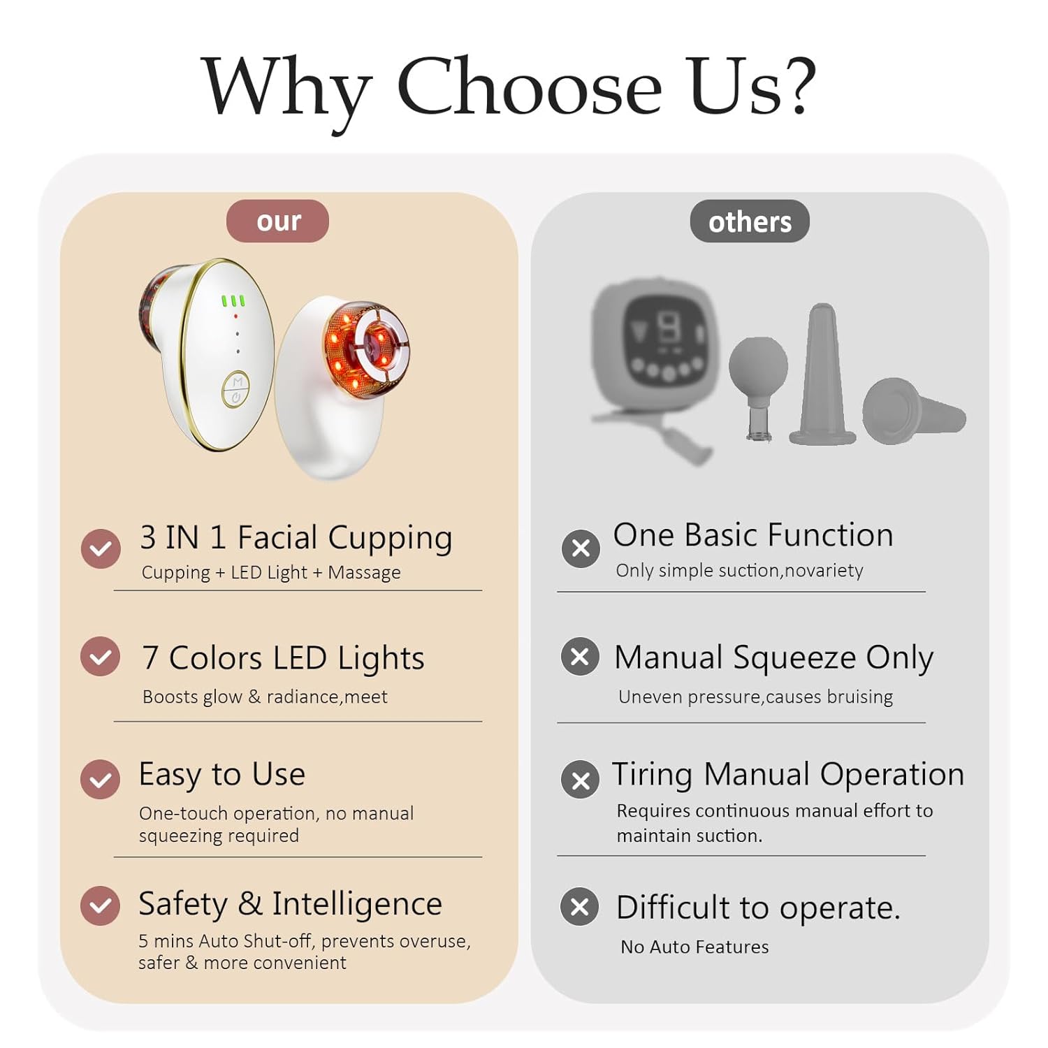 Electric Facial Cupping: Say goodbye to tedious manual squeezing. Our electric facial cupping tool offers a convenient, cordless experience with easy recharging, making your daily facial rejuvenation both simple and effective.
