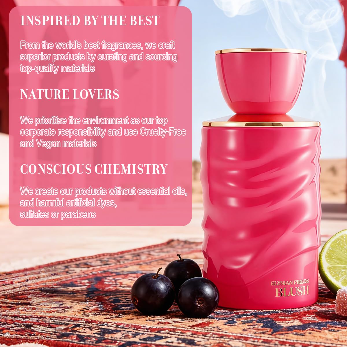 CONCENTRATED PERFUME ELYSIAN FIELDS – BLUSH: A delightful sweet floral fragrance with top notes of fruity berries and mandarin, heart notes of jasmine and vanilla, and base notes of gardenia and soft caramel. Feminine, playful, and irresistibly charming.