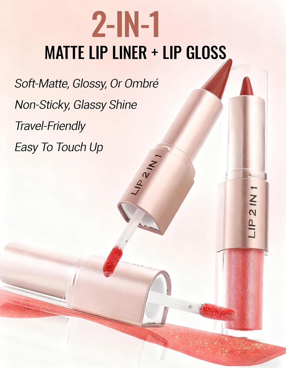 【2-in-1 Lip Combo】A sleek dual-ended design combines a precision lip liner and a glass-shine gloss in one tool. Define, fill, and finish fast, perfect as an everyday lip kit or on-the-go touch-ups