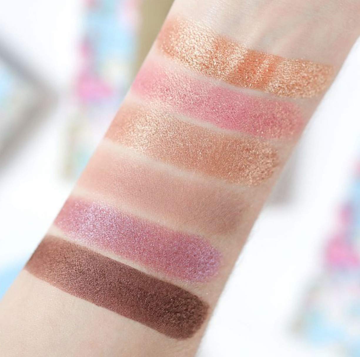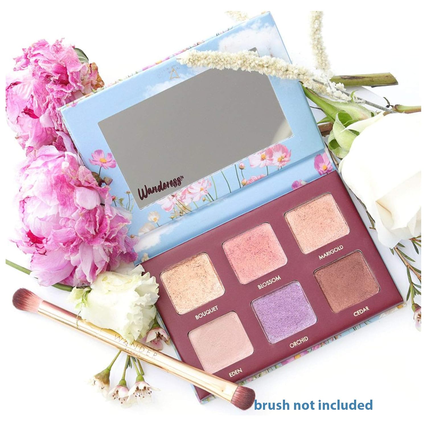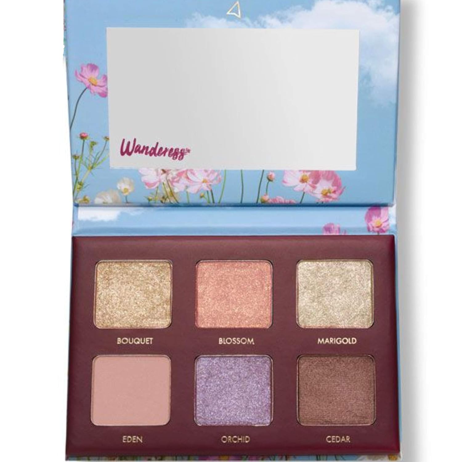 Wander Beauty’s Wanderess Fling Eyeshadow Palette includes: Bouquet: foil champagne gold Blossom: shimmer pink Marigold: foil gold Eden: matte nude Orchid: shimmer light purple Cedar: satin brown