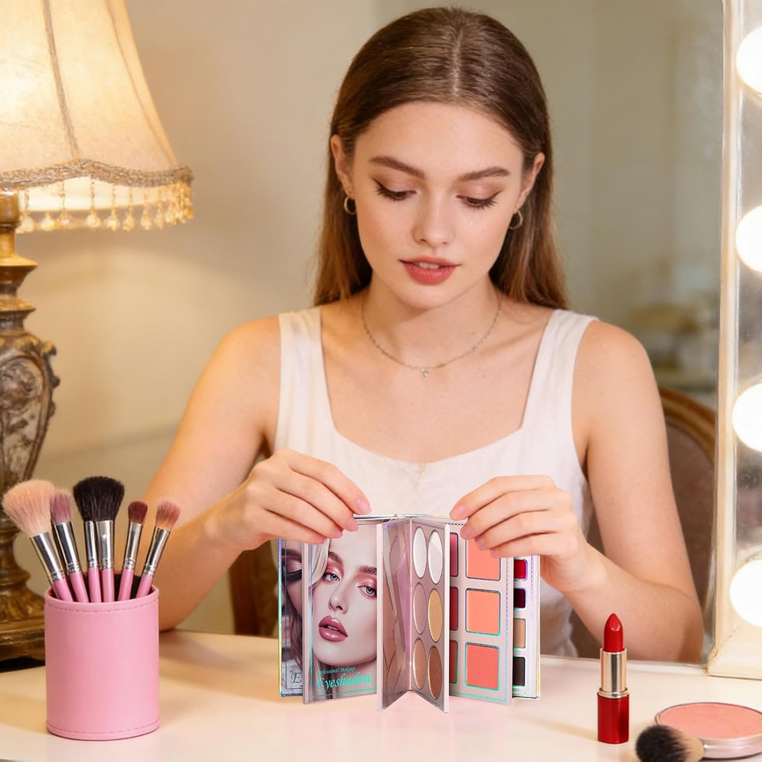 Facial Makeup Pallet, Complete Face Contour Kit, Matte, Shimmer Eyeshadow, Pigmented Bronzer, Glow Highlighter, Portable Beauty Book for Women