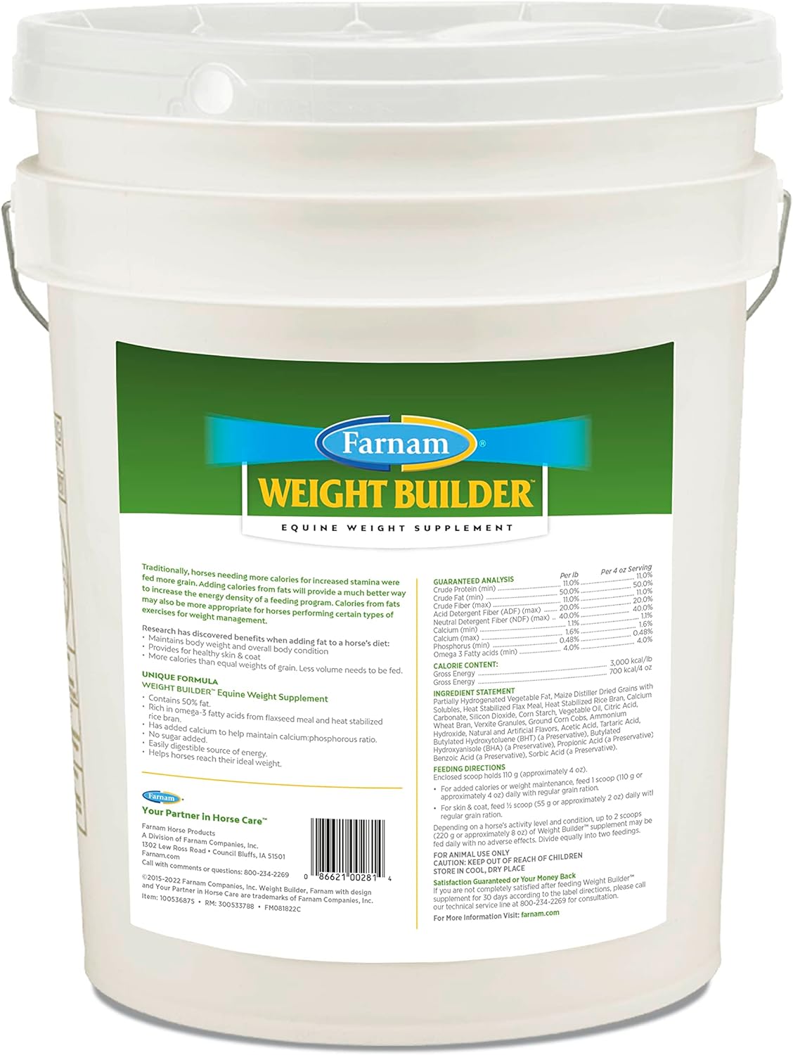 Horses must consume enough calories to meet their daily energy requirements. For horses that need additional calories, it can be challenging to maintain a healthy weight. Fat contains 2.25 times more energy than carbohydrates and is a good way to safely increase calories without a drastic change in feed volume. Weight Builder Equine Weight Supplement is nutritionally formulated with 50% fat for a concentrated source of calories to help maintain optimal weight and body condition. The high-fat formula adds easily digested calories to provide the controlled energy needed to meet rigorous performance demands without the risk of digestive upset associated with feeding extra grain. Weight Builder Equine Weight Supplement is also rich in omega-3 fatty acids to help promote healthy skin and a glossy coat. No sugar added, and specially formulated with supplementary calcium to help maintain the calcium-phosphorous ratio for growing horses. This palatable, easy-to-feed powder mixes in easily with the horse’s daily grain ration.
