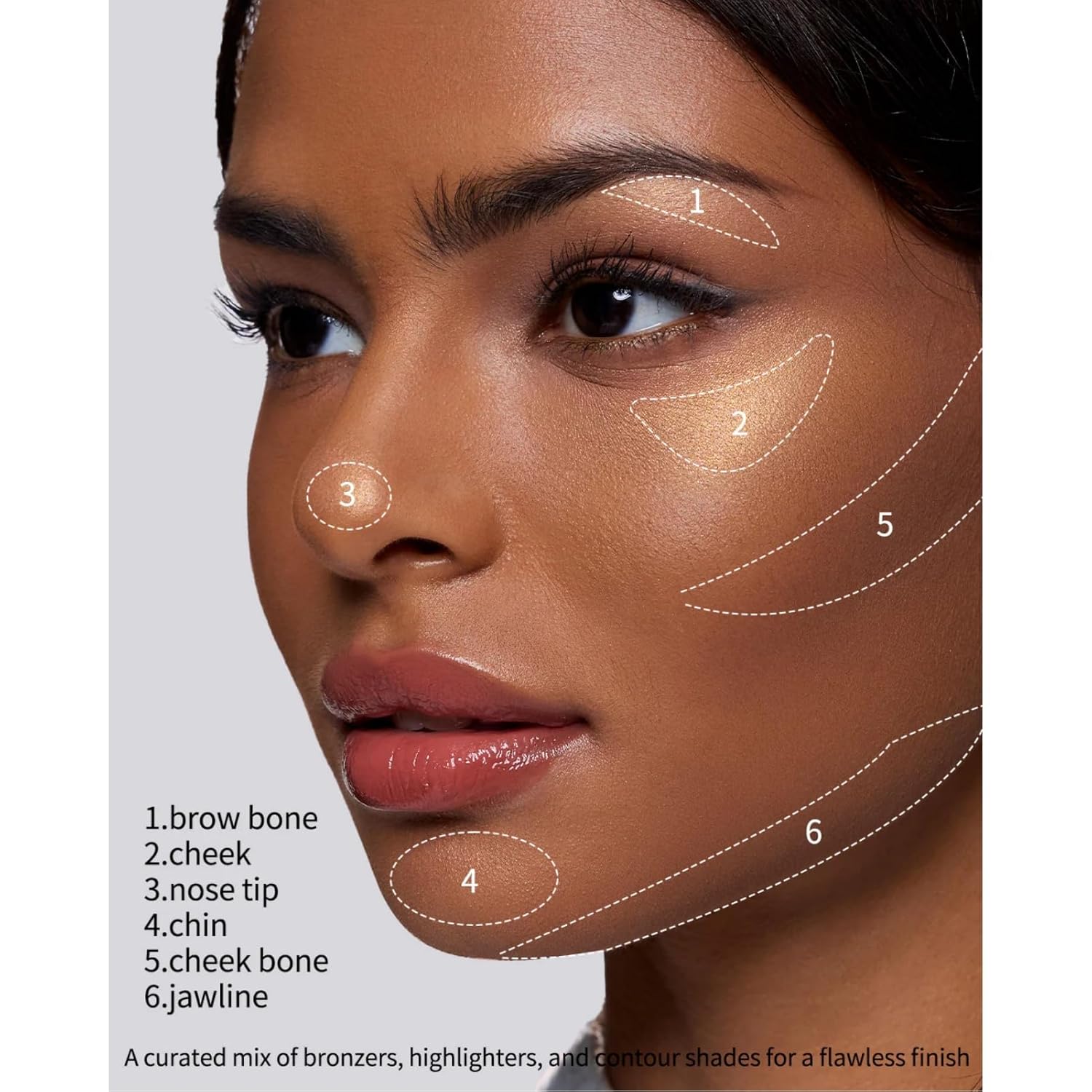4-Color Highlight & Contour Palette: This palette features 4 expertly curated contour shades combines bronzers,highlighters,and contour shades—with a fine-milled texture that blends seamlessly.Achieve effortless highlighting,contouring,and a radiant,sculpted effect with minimal fallout,suitable for all skin types