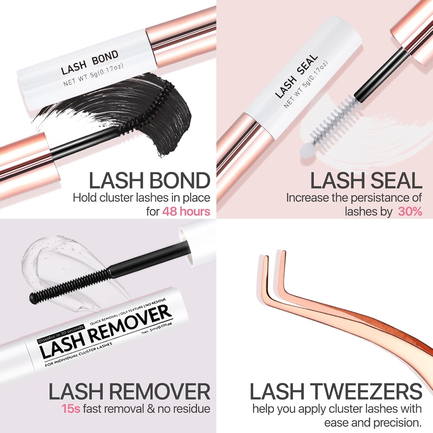 Lash Bond & Seal and Remover: Both lash glue and remover are cruelty-free and vegan, gentle on skin and harmless to real eyelashes. Since the lash glue is super strong hold for more than 48 hours, it’s recommended to remove it with our deep cleansing lash remover for quick and easy removal.