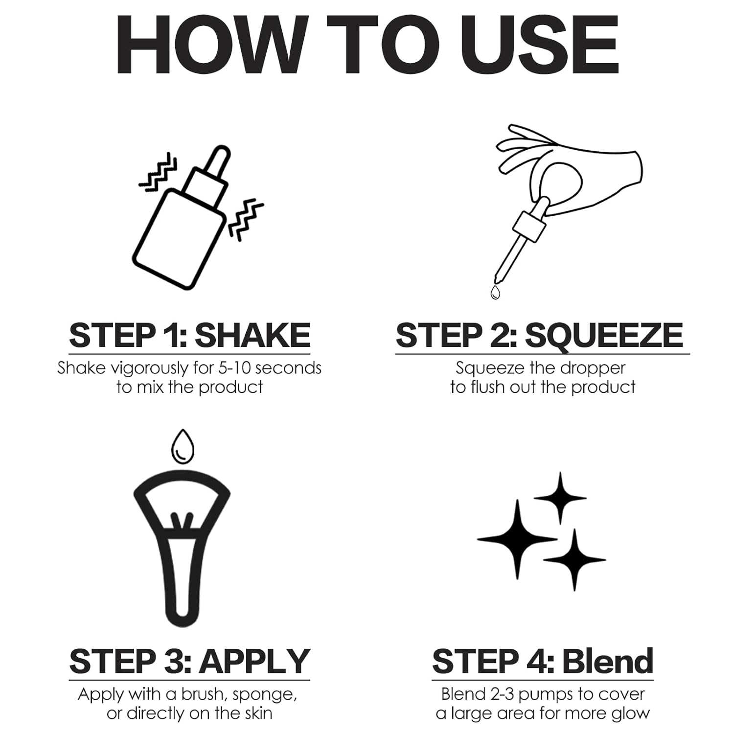 HOW TO USE – Apply the liquid highlighter alone or add some drops to other makeup products to customize your glow complexion. Notes: Please wait a moment to let it dry completely.