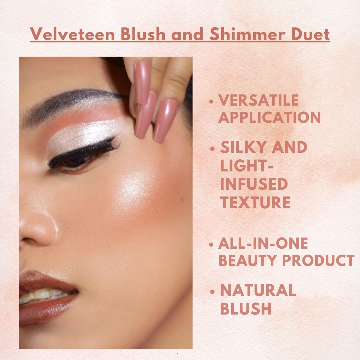 VELVETEEN BLUSH POWDER. Our Velveteen Blush and Shimmer Duet-48 is a premium quality blush powder that sculpts the face and décolleté, delivering a seamless multidimensional look. This is a must-have addition to your makeup products.