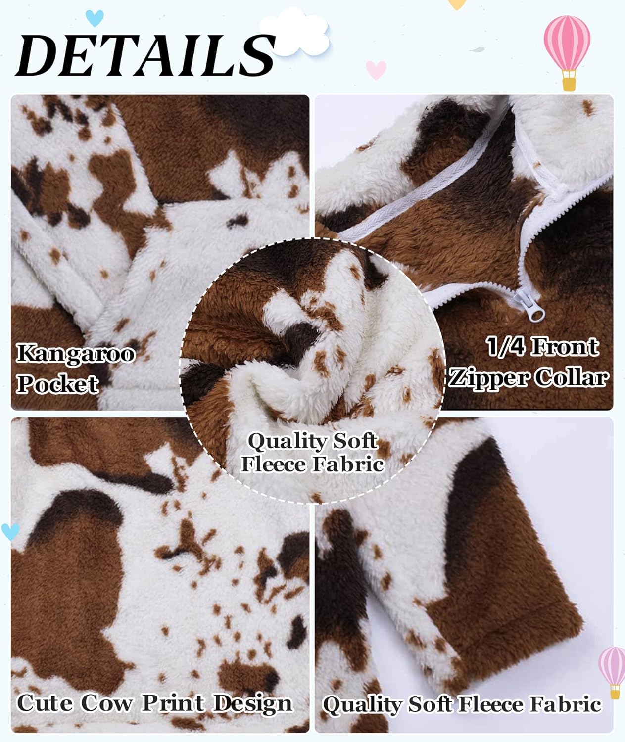 Children’s Cow Fleece Pullover Suitable for Boys and GirlsFeatures: Cute and soft, kangaroo pocket, quarter zipper