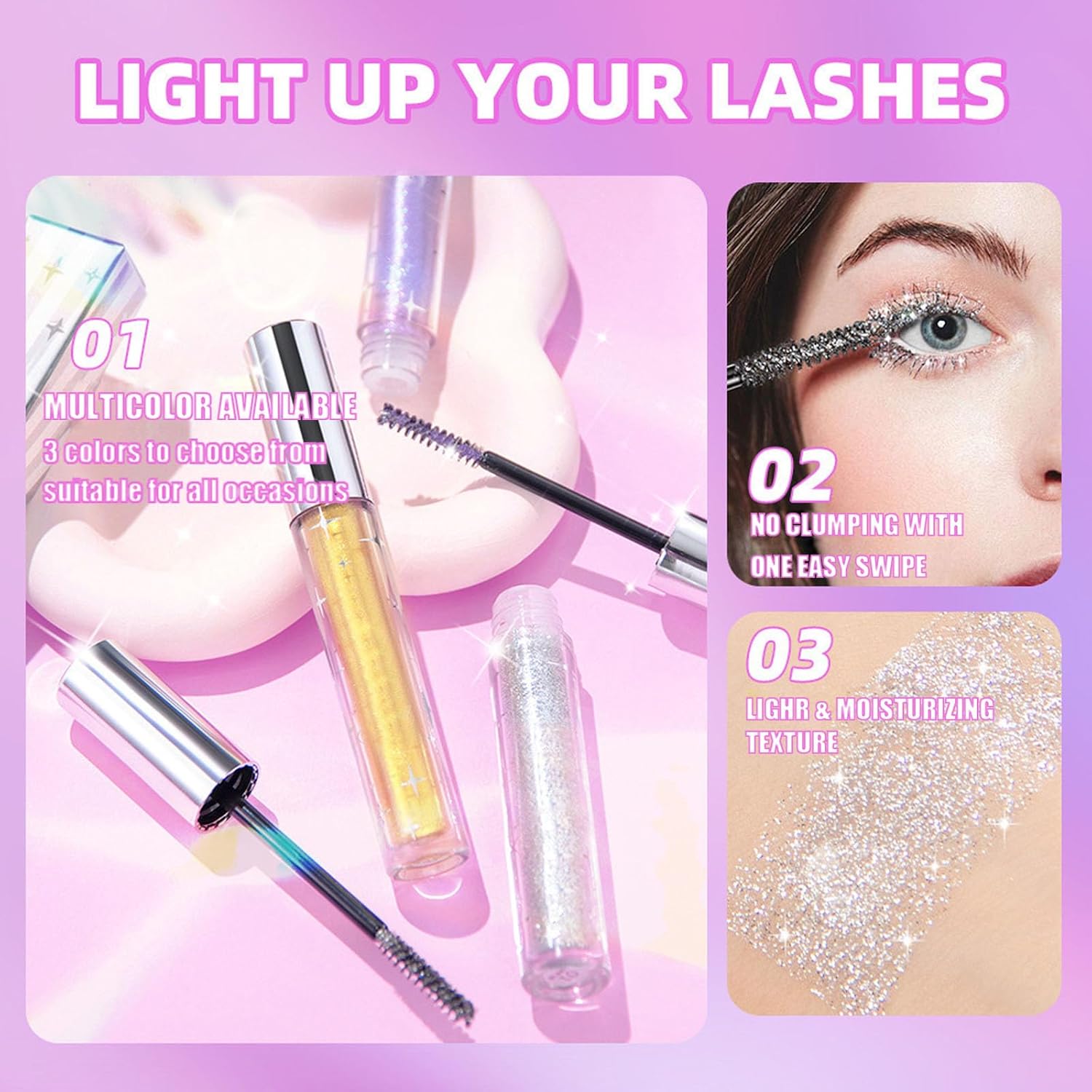 [Glitter Mascara]: We offer three charming and shiny mascaras in three colors: gold glitter mascara, silver glitter mascara and purple glitter mascara. The sparkly mascara contains a high concentration of fine pearlescent particles, and each eyelash is wrapped with exquisite diamond sequins. This diamond mascara can add a unique fashion element to creating a charming makeup look