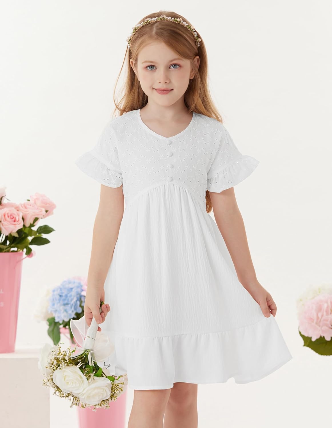 GRACE KARIN Girls Dress Lace Button Front Flutter Sleeve Swing Tiered Summer Spring Party Casual Fashion Sun Dresses