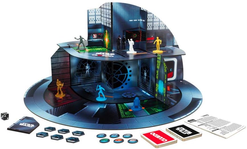 Includes 6 Star Wars character pawns, 5-piece cardboard gameboard (bottom level, back wall, 2 supporting walls, top level), mission notepad, die, 6 vehicle tokens, 6 planet tokens, mission folder, 21 Clue cards (red deck), 19 corridor cards (black deck), and game guide