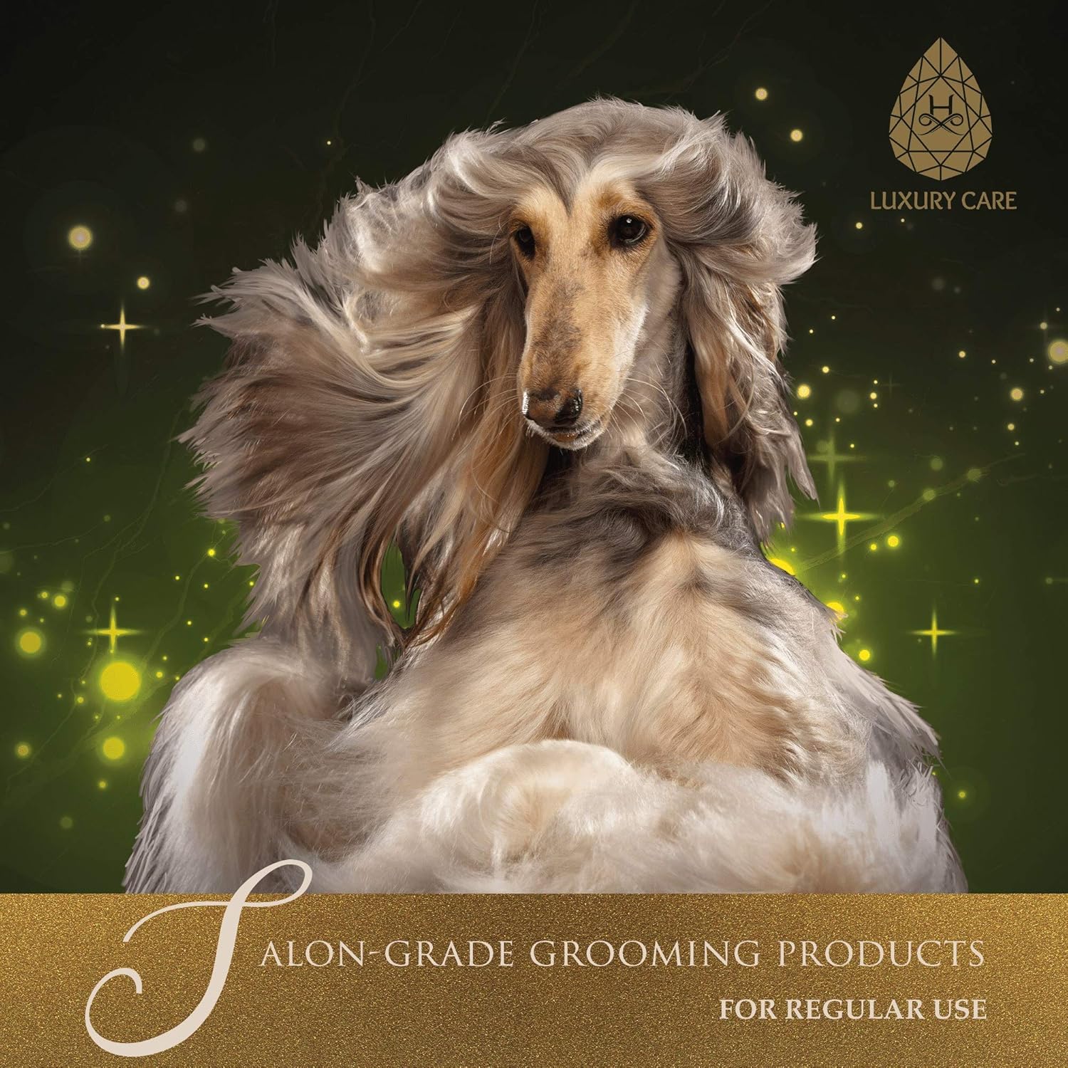 A collie dog beside a shampoo bottle. Text reads: Exclusive Luxury Fragrance.A collie dog beside a shampoo bottle. Text reads: Exclusive Luxury Fragrance.